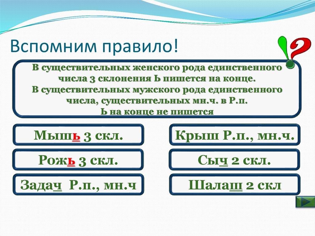 Вспомним правило!В существительных женского рода единственного