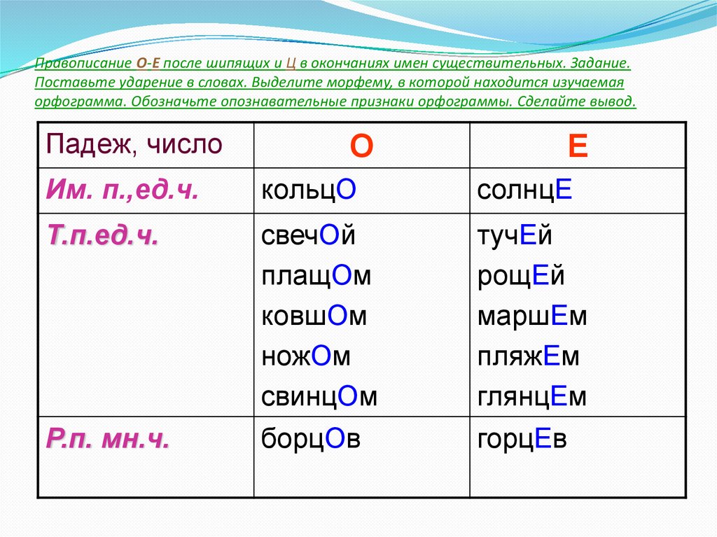 Правописание О-Е после шипящих и Ц в окончаниях имен существительных. Задание.Поставьте ударение в словах. Выделите морфему, в которой находится изучаемая