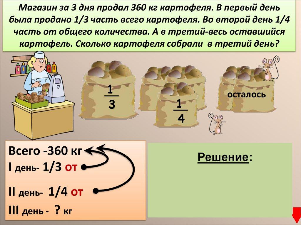 Магазин за 3 дня продал 360 кг картофеля. В первый деньбыла продано 1/3 часть всего картофеля. Во второй день 1/4