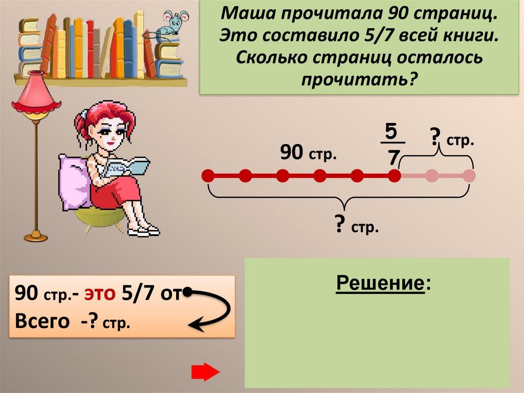 Маша прочитала 90 страниц.Это составило 5/7 всей книги.