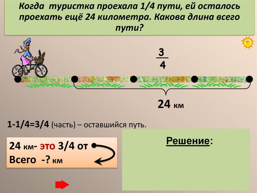 Когда туристка проехала 1/4 пути, ей осталосьпроехать ещё 24 километра. Какова длина всего