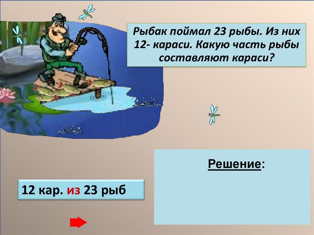 Рыбак поймал 23 рыбы. Из них12- караси. Какую часть рыбы
