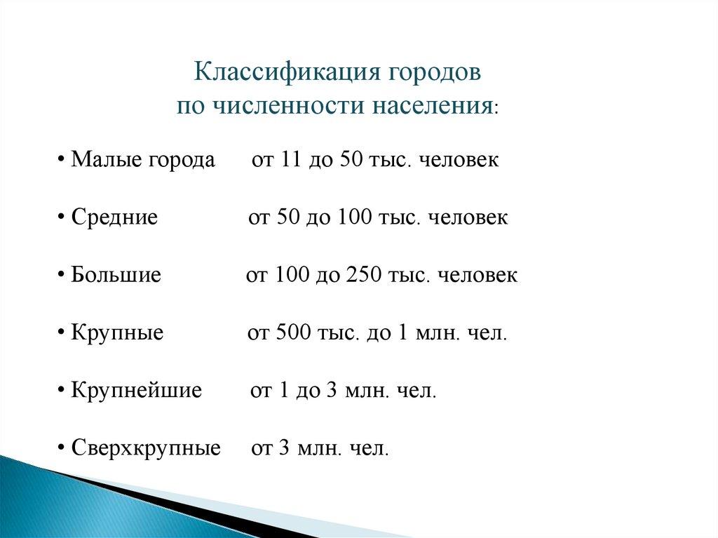Классификация городовпо численности населения: