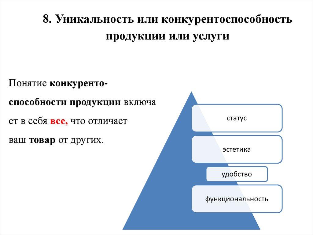 8. Уникальность или конкурентоспособностьпродукции или услуги