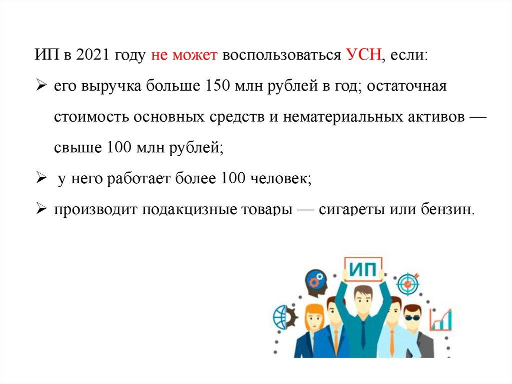 ИП в 2021 году не может воспользоваться УСН, если:его выручка больше 150 млн рублей в год; остаточная