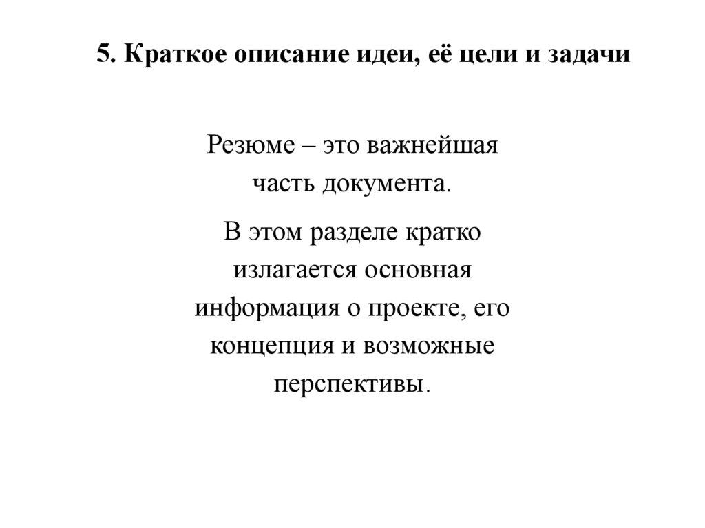 5. Краткое описание идеи, её цели и задачиРезюме – это важнейшая