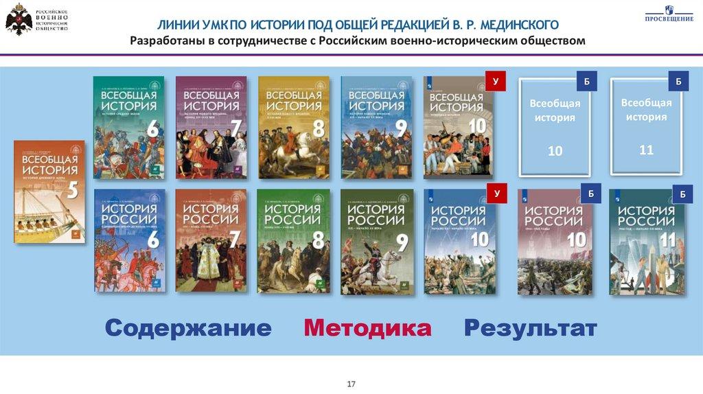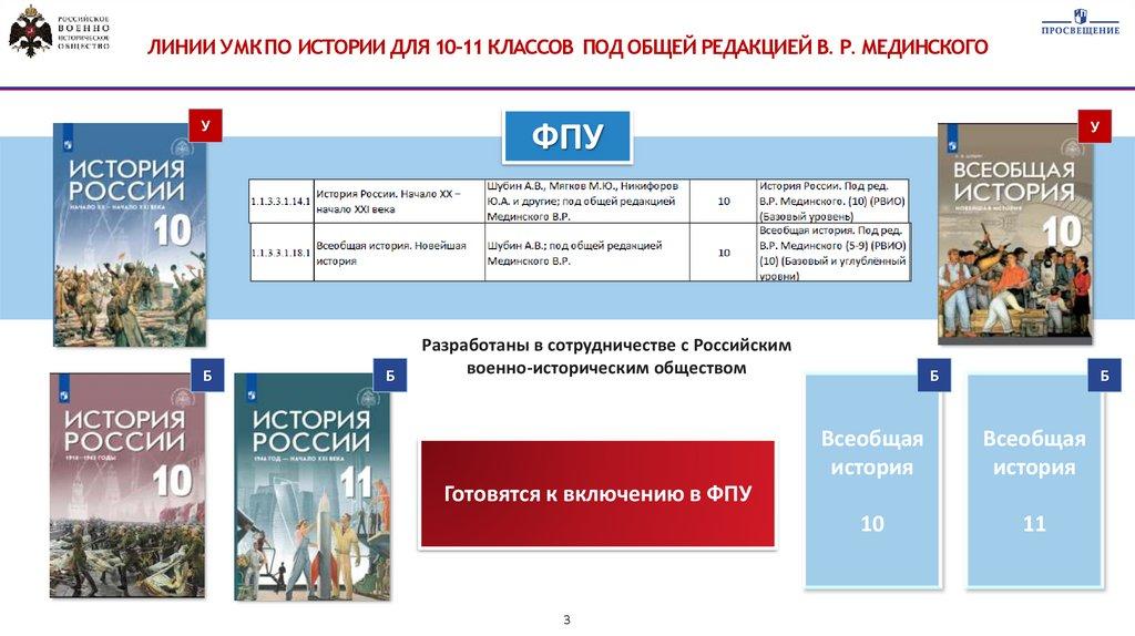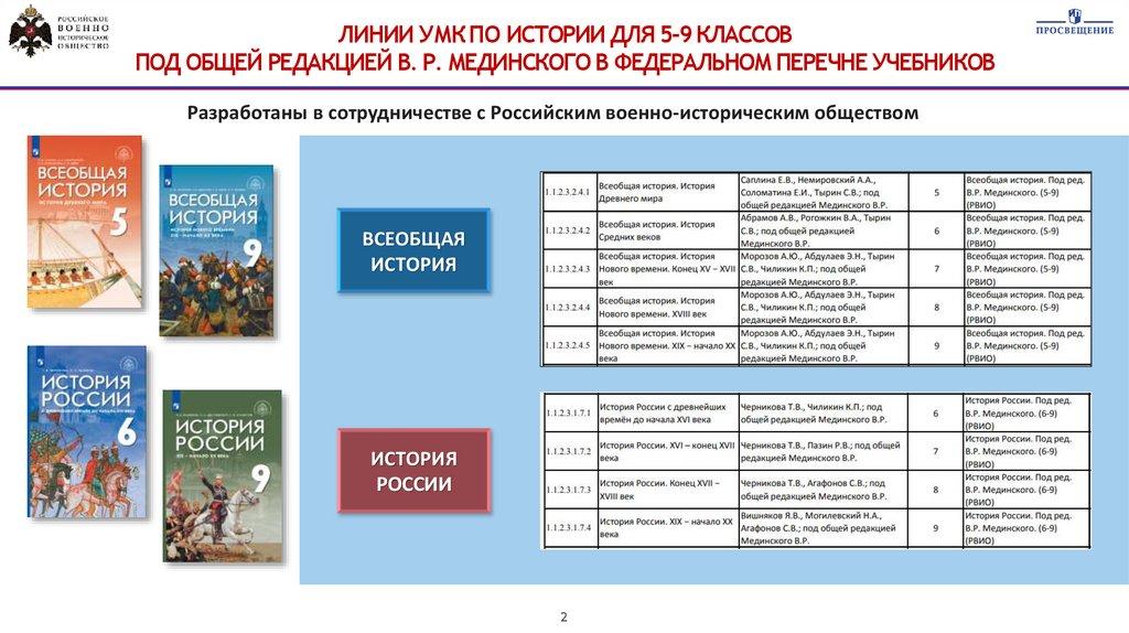 ЛИНИИ УМК ПО ИСТОРИИ ДЛЯ 5-9 КЛАССОВПОД ОБЩЕЙ РЕДАКЦИЕЙ В. Р. МЕДИНСКОГО В ФЕДЕРАЛЬНОМ ПЕРЕЧНЕ УЧЕБНИКОВ