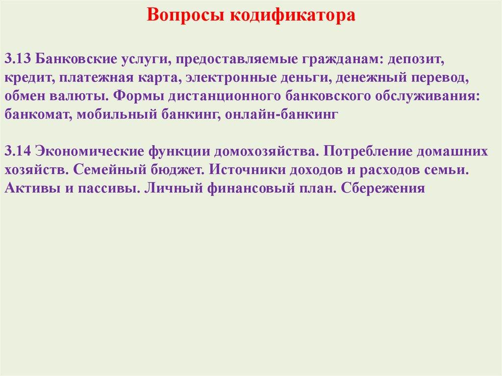 Вопросы кодификатора3.13 Банковские услуги, предоставляемые гражданам: депозит,