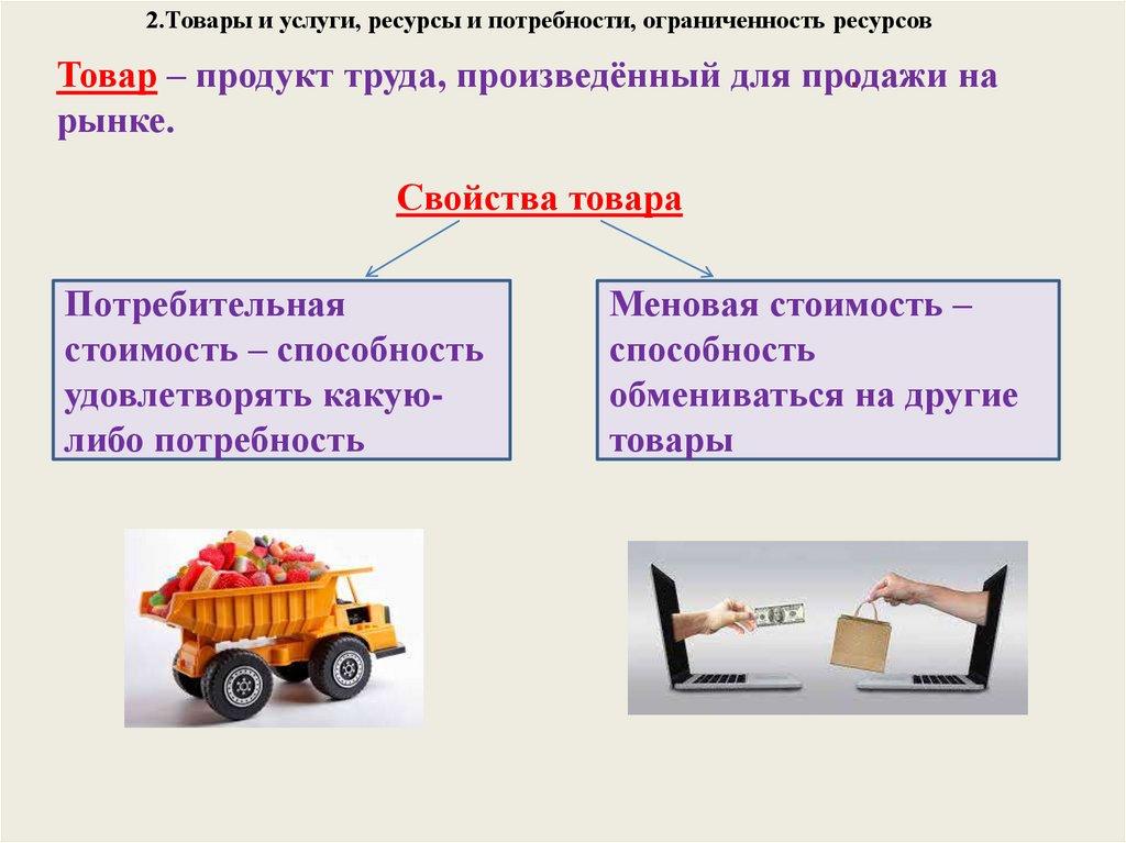 2.Товары и услуги, ресурсы и потребности, ограниченность ресурсовТовар – продукт труда, произведённый для продажи