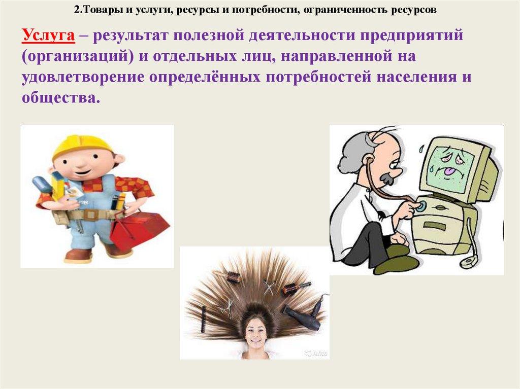 2.Товары и услуги, ресурсы и потребности, ограниченность ресурсовУслуга – результат полезной деятельности предприятий