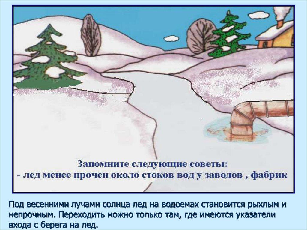 Под весенними лучами солнца лед на водоемах становится рыхлым инепрочным. Переходить можно только там, где имеются указатели