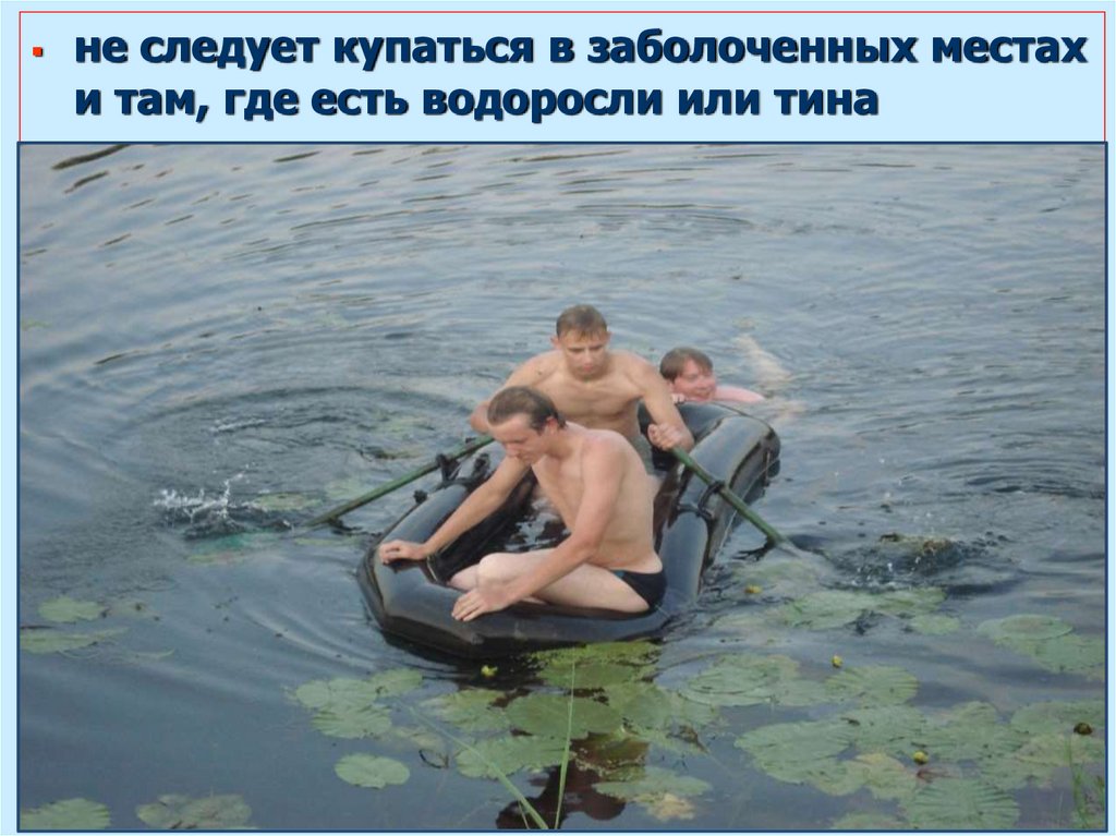 не следует купаться в заболоченных местахи там, где есть водоросли или тина