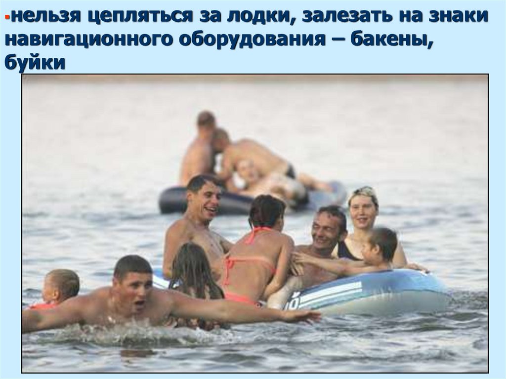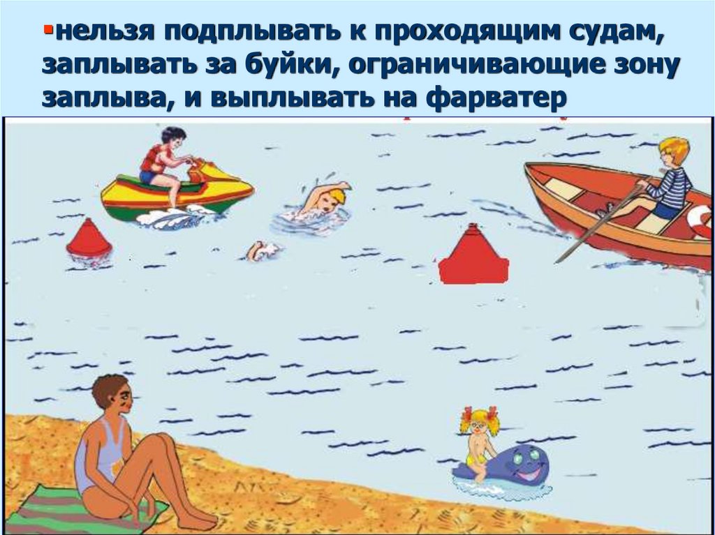 нельзя подплывать к проходящим судам,заплывать за буйки, ограничивающие зону