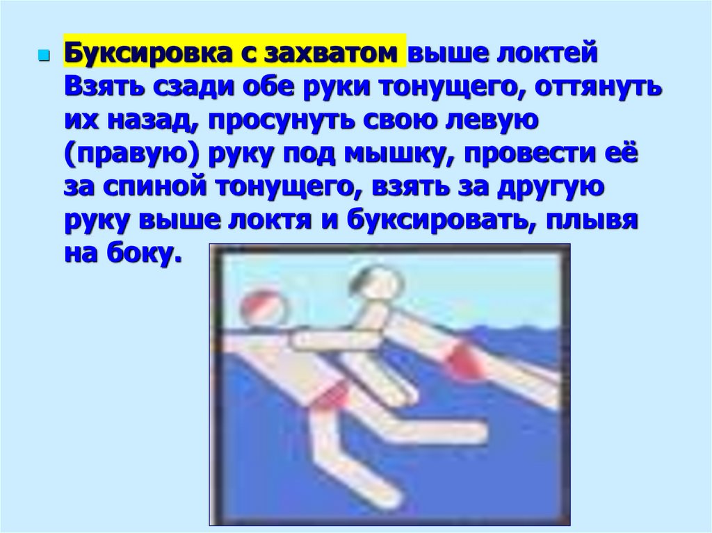 Буксировка с захватом выше локтейВзять сзади обе руки тонущего, оттянуть