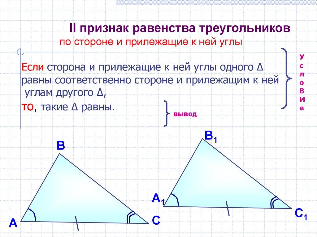 II признак равенства треугольниковпо стороне и прилежащие к ней углы