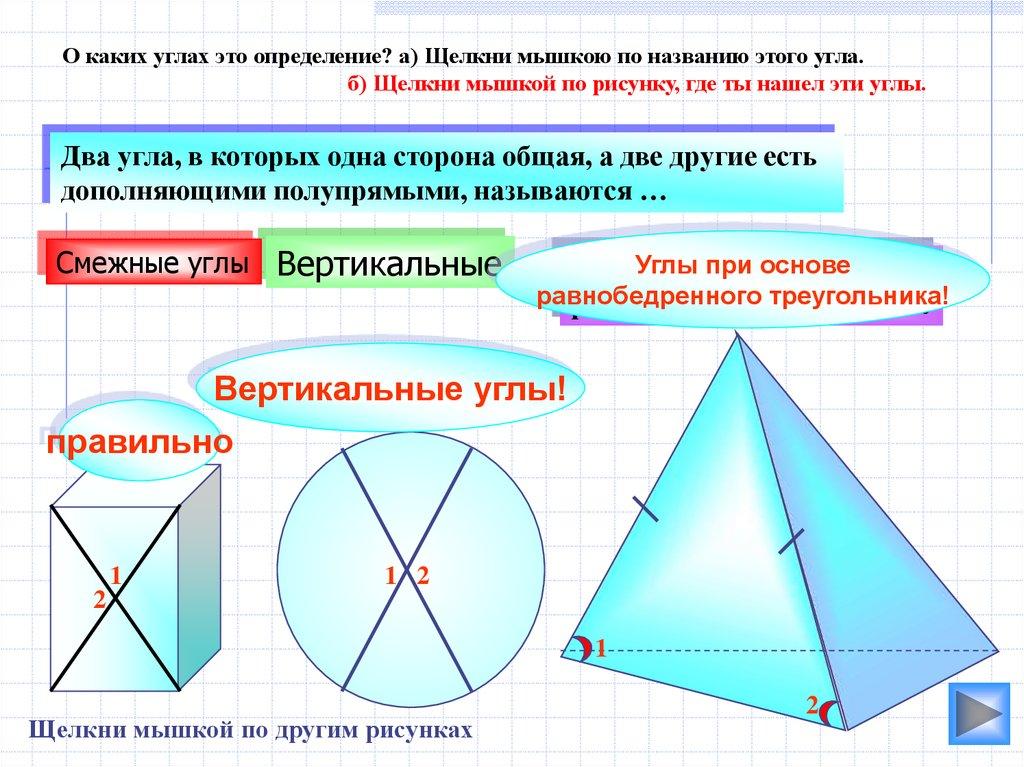 О каких углах это определение? а) Щелкни мышкою по названию этого угла.б) Щелкни мышкой по рисунку, где ты нашел эти углы.