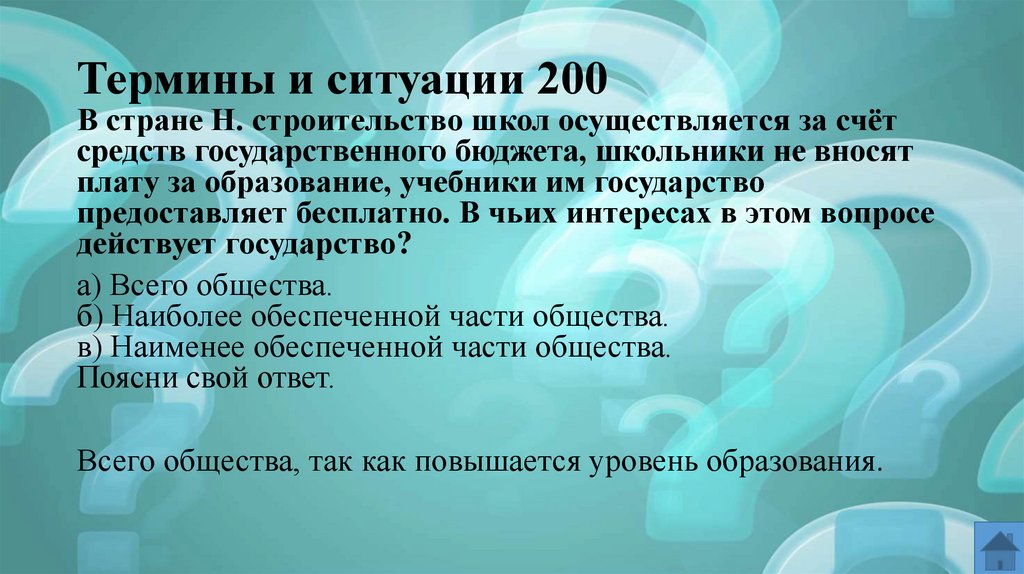 Термины и ситуации 200В стране Н. строительство школ осуществляется за счёт