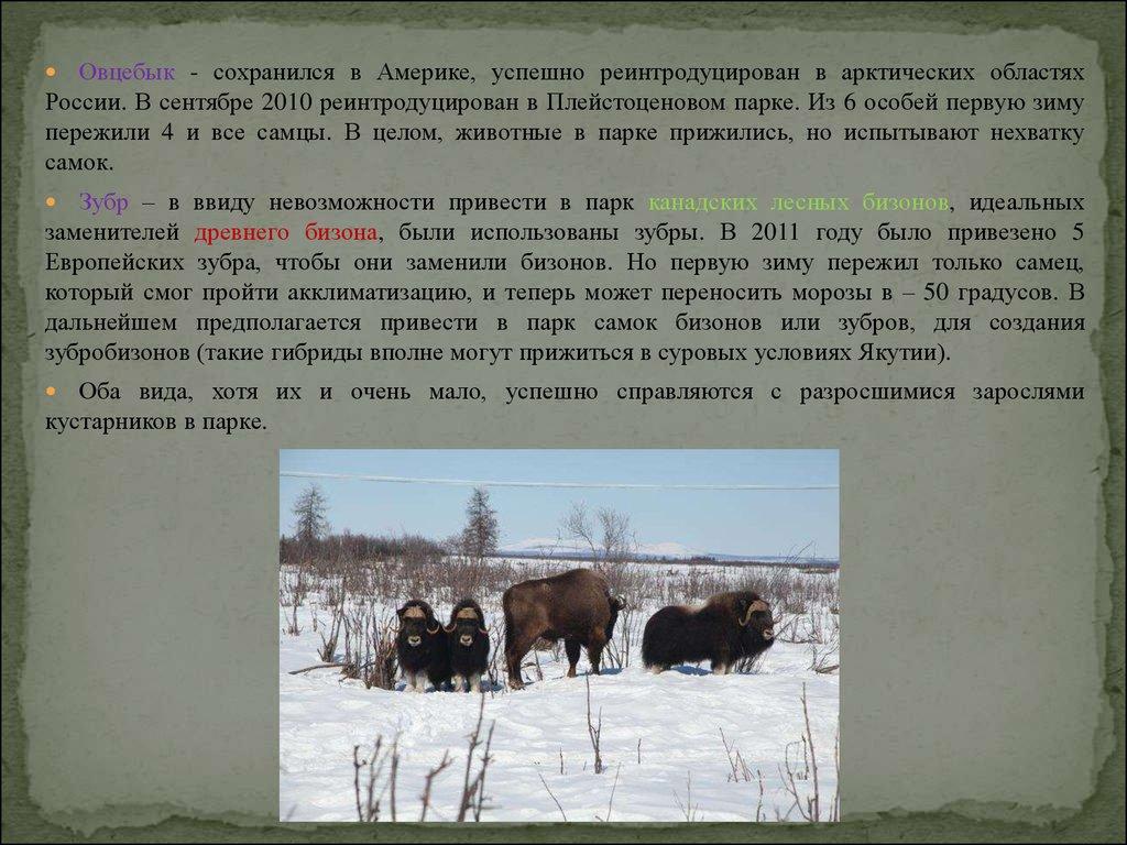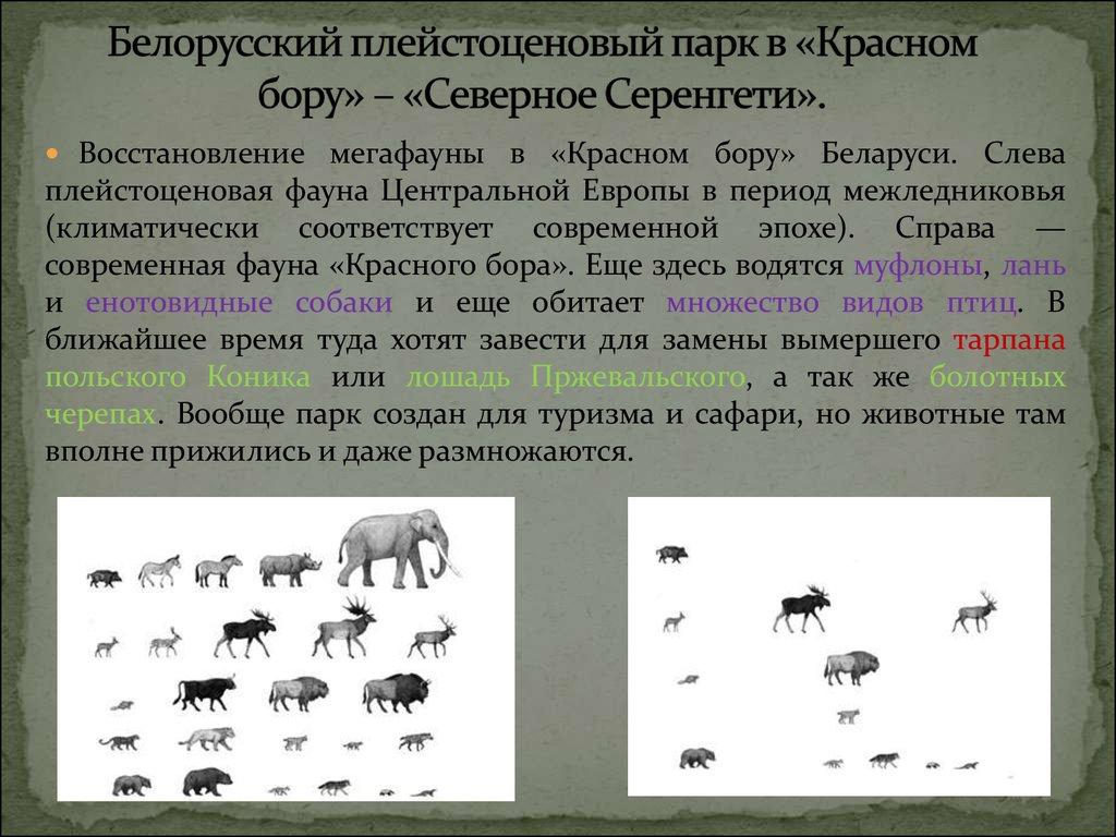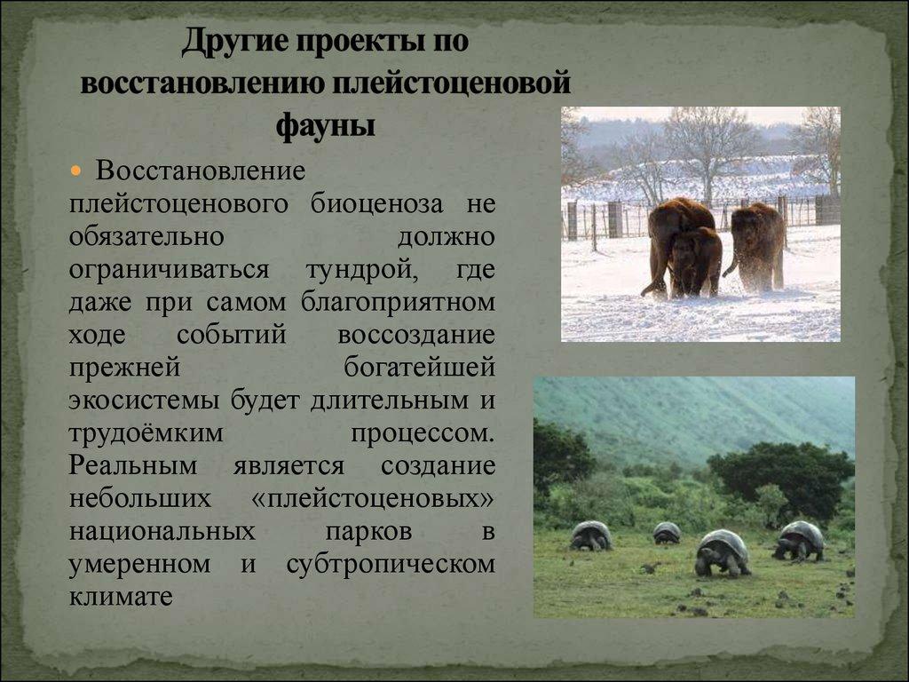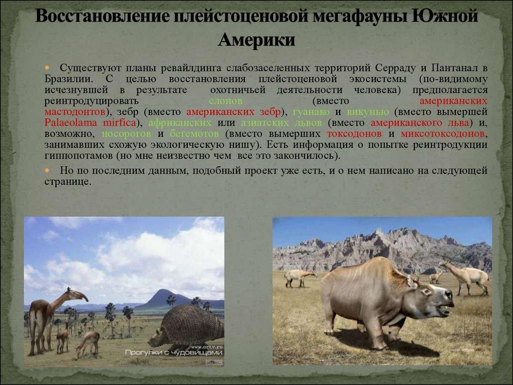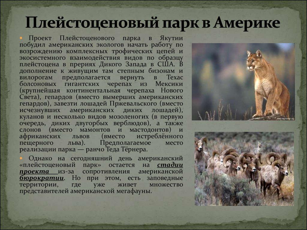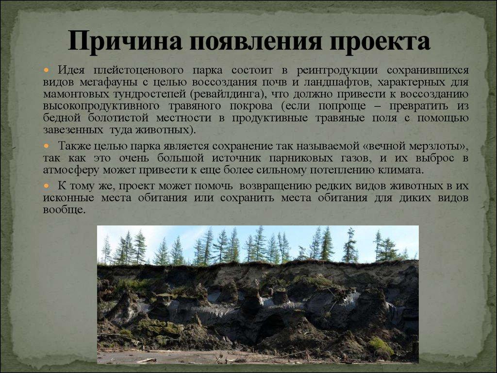 Идея плейстоценового парка состоит в реинтродукции сохранившихсявидов мегафауны с целью воссоздания почв и ландшафтов, характерных для
