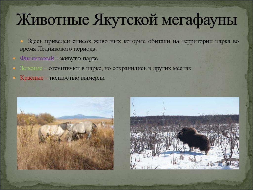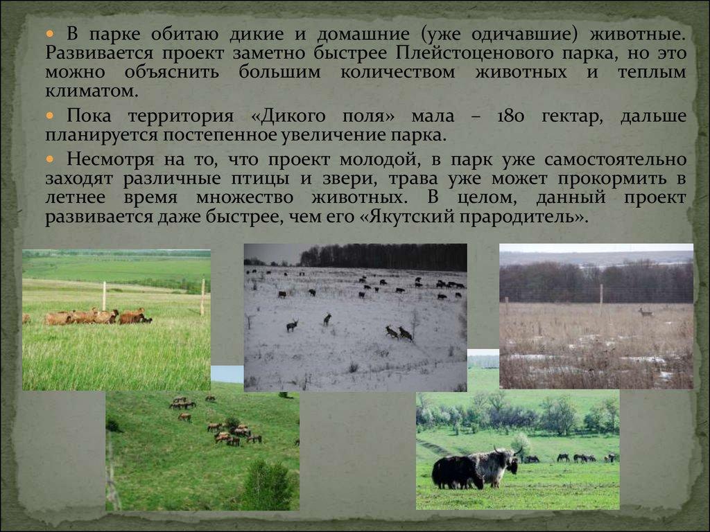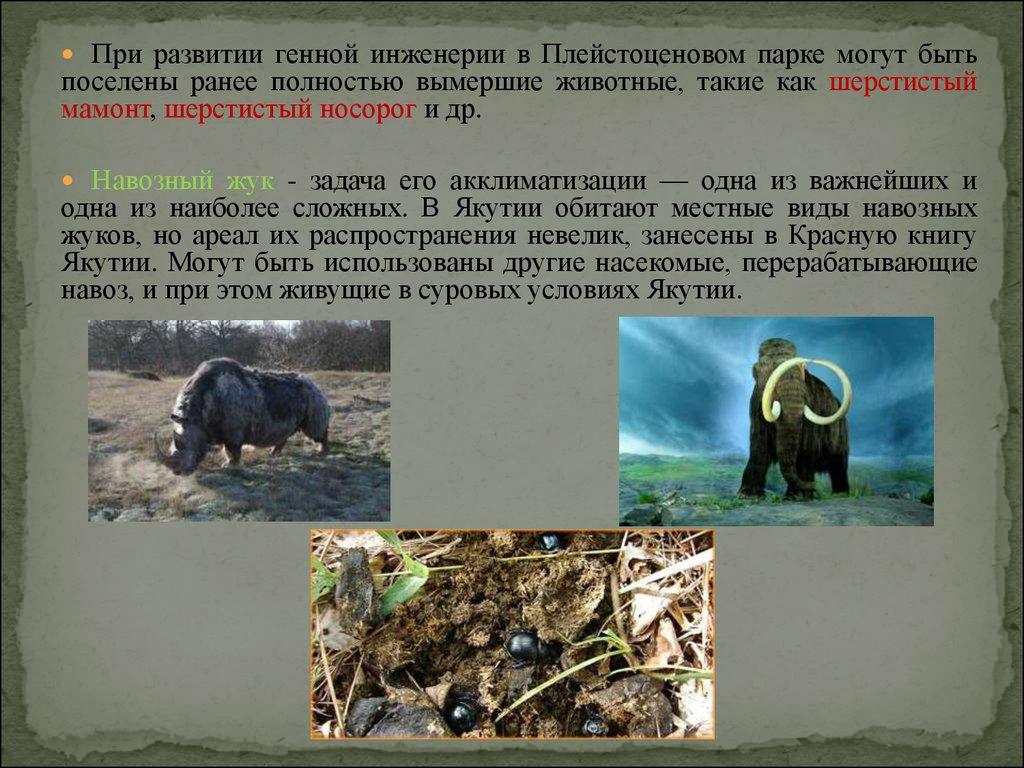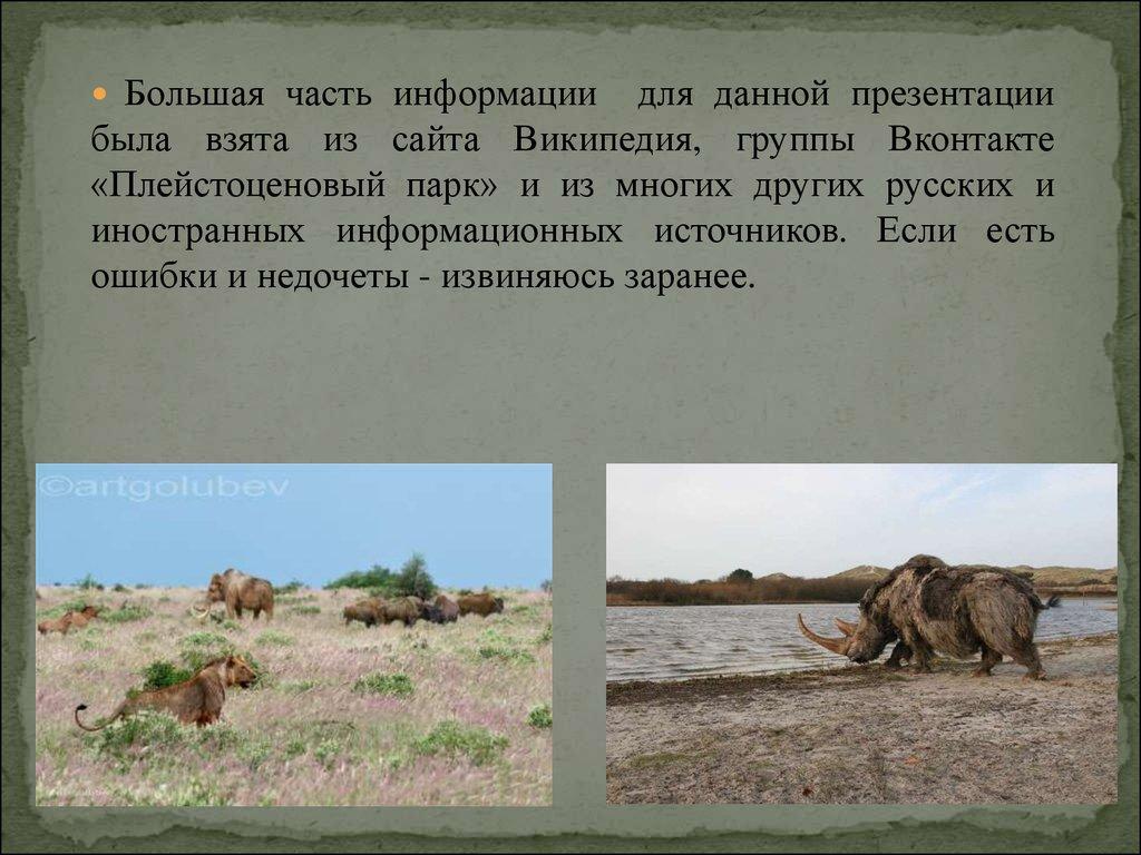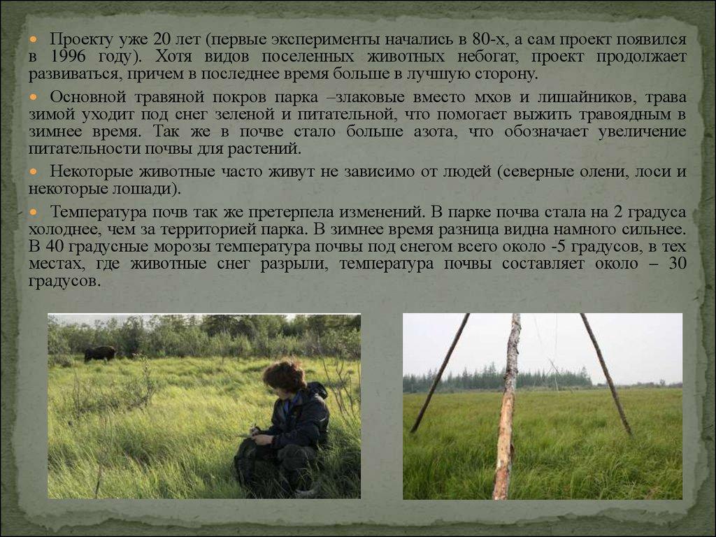 Идея плейстоценового парка состоит в реинтродукции сохранившихсявидов мегафауны с целью воссоздания почв и ландшафтов, характерных для