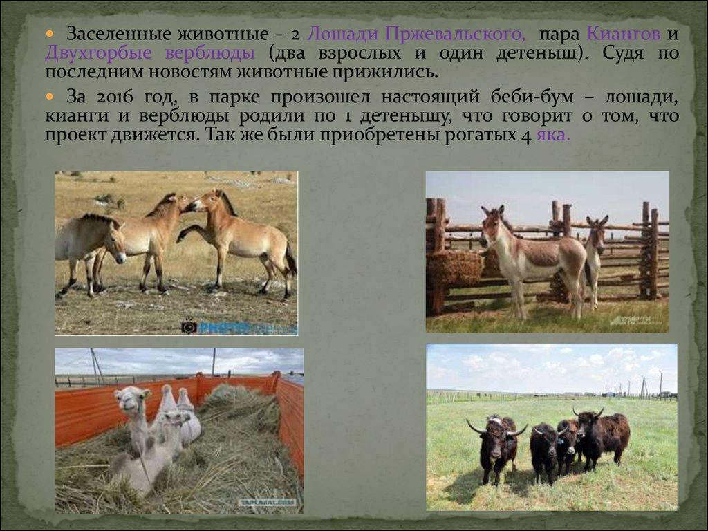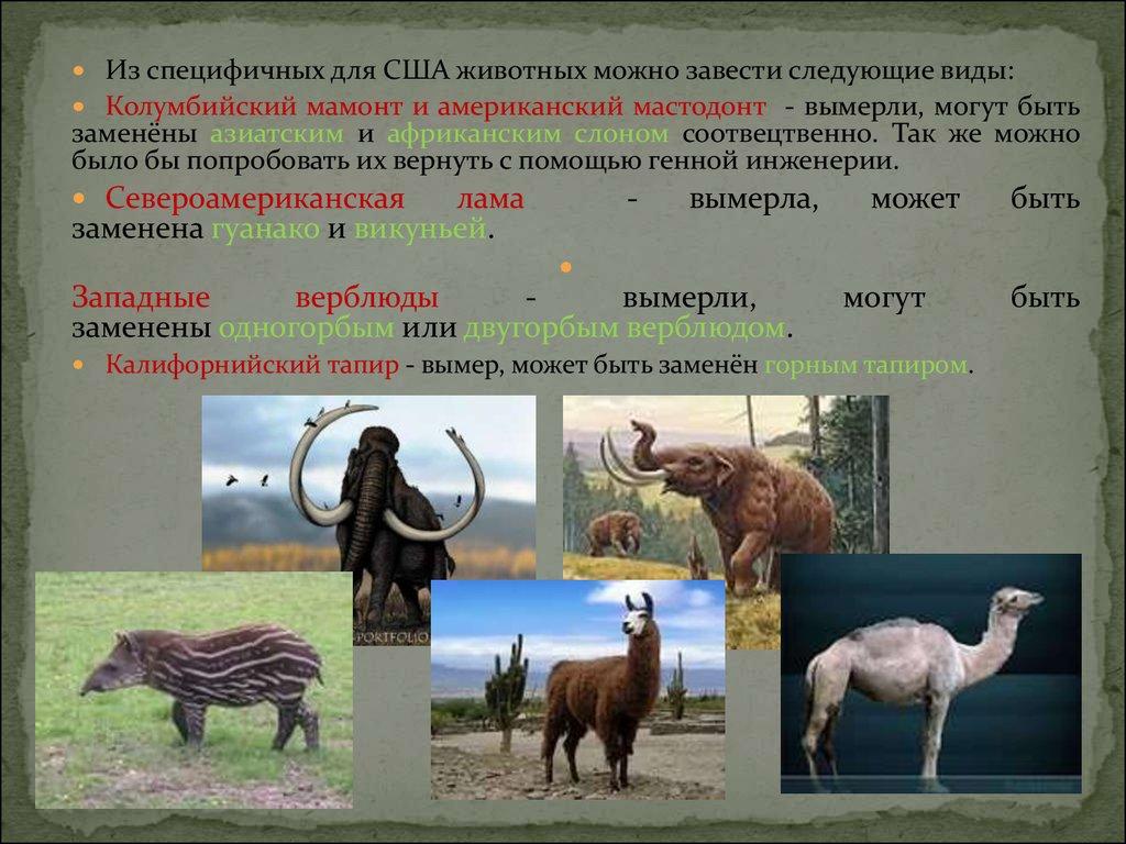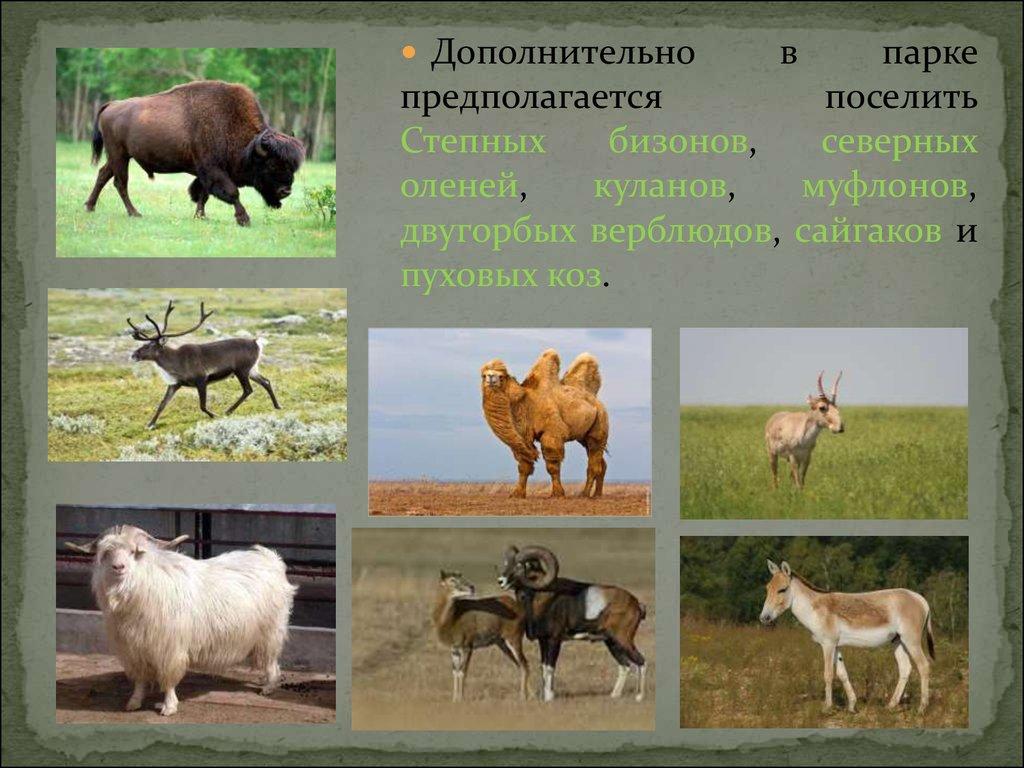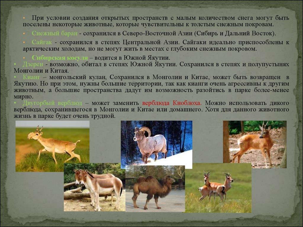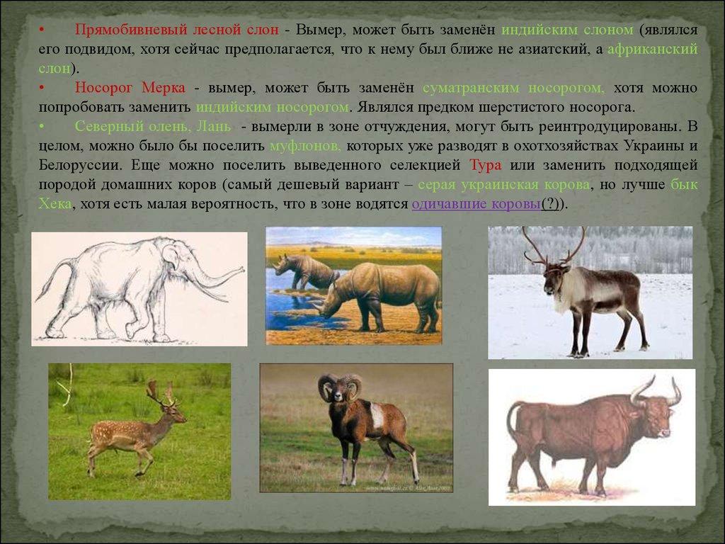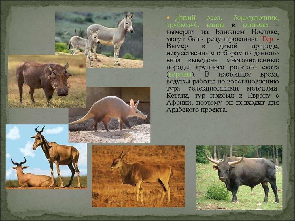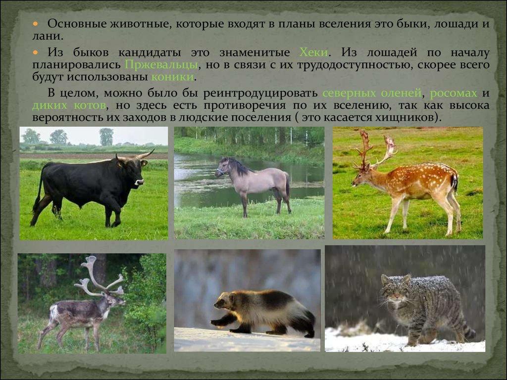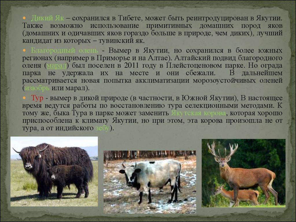 животные сохранились только в домашнем или вторично одичавших формах (коровыпотомки туров, одногорбый верблюд и другие) да и диких животных для таких проектов