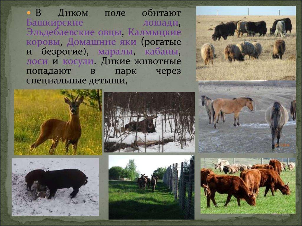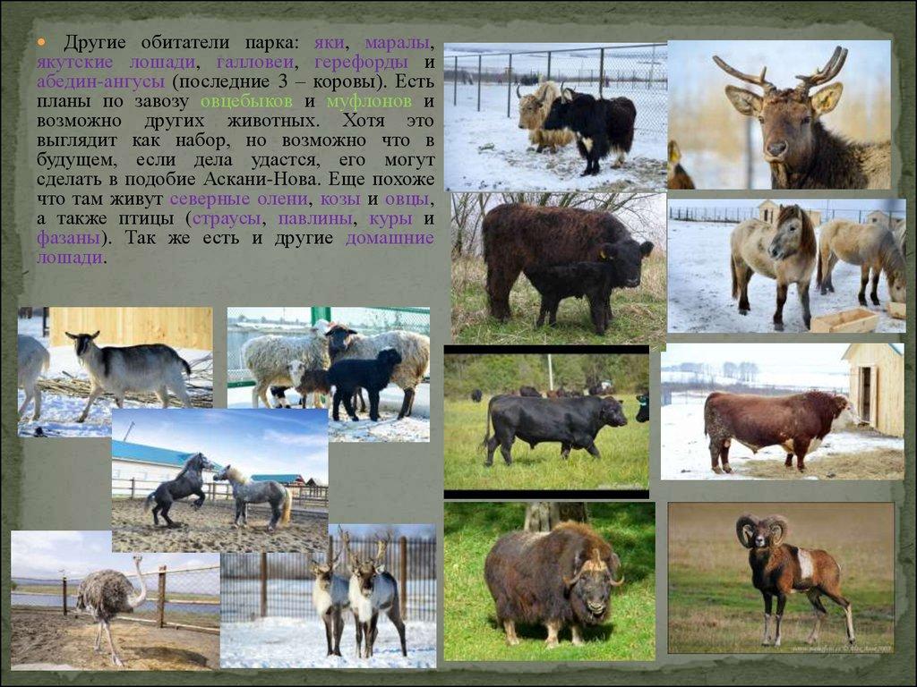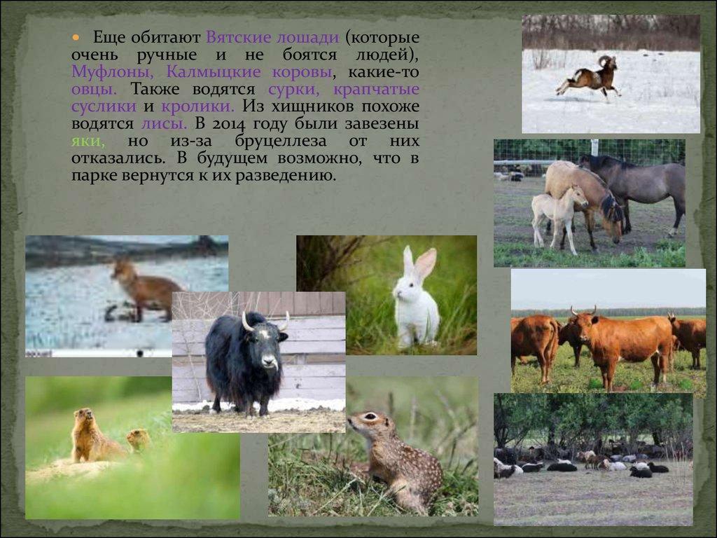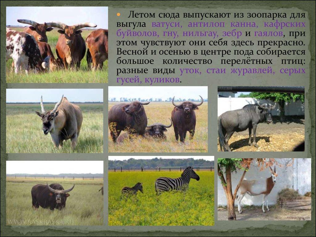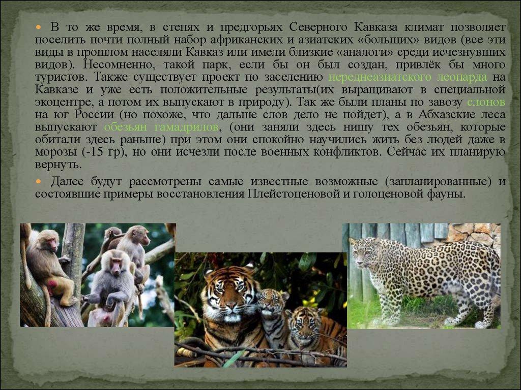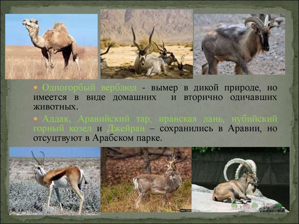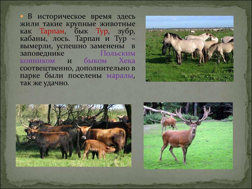 животные сохранились только в домашнем или вторично одичавших формах (коровыпотомки туров, одногорбый верблюд и другие) да и диких животных для таких проектов