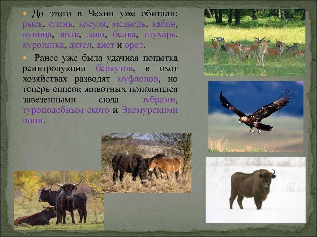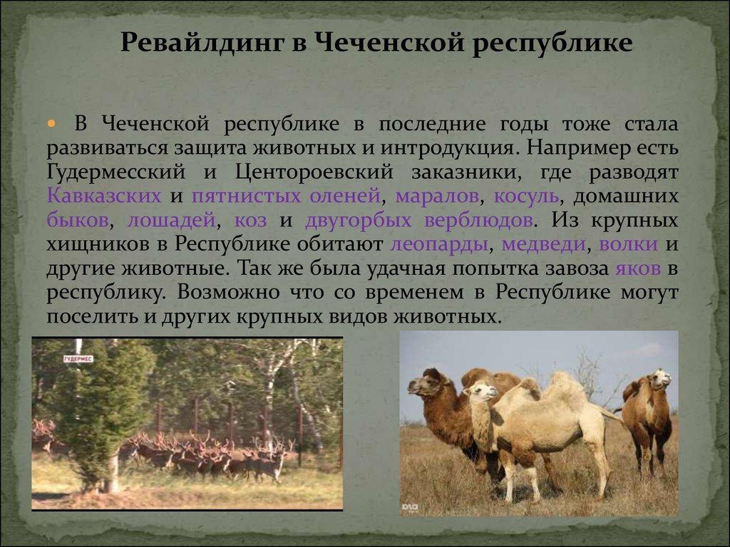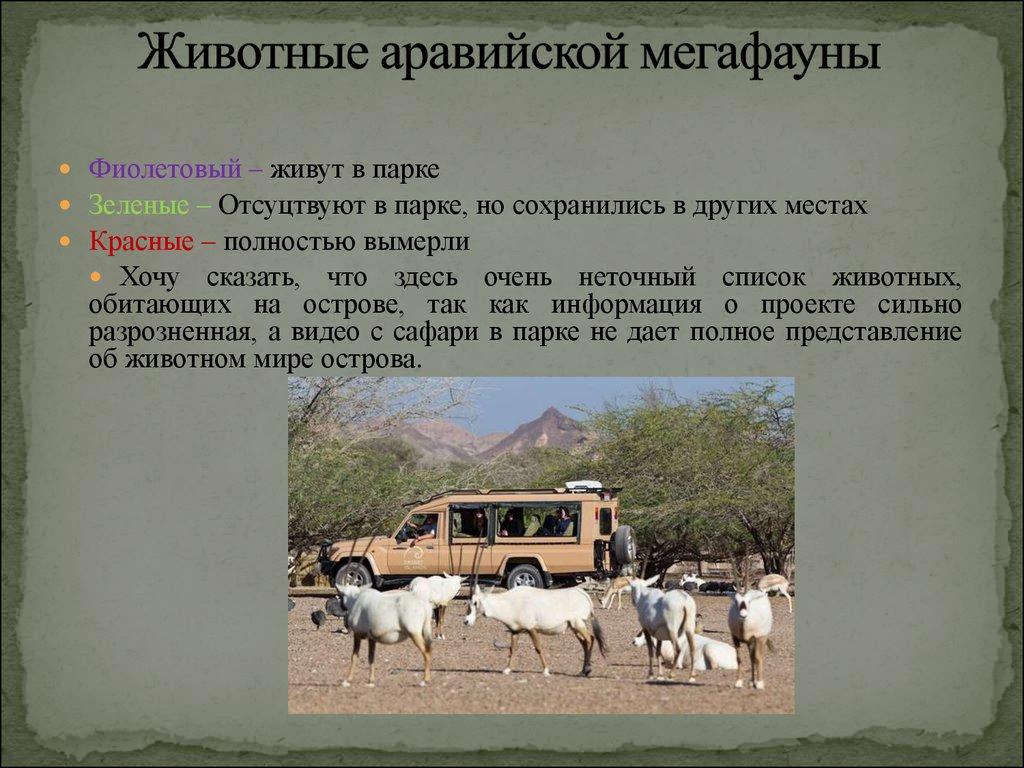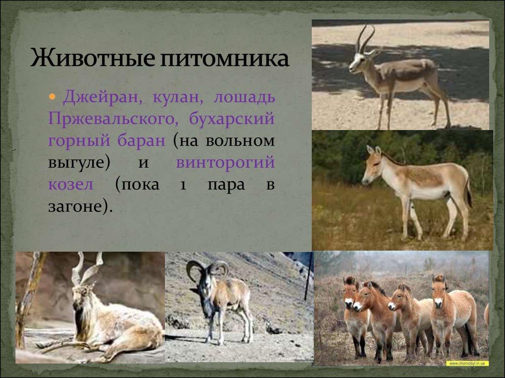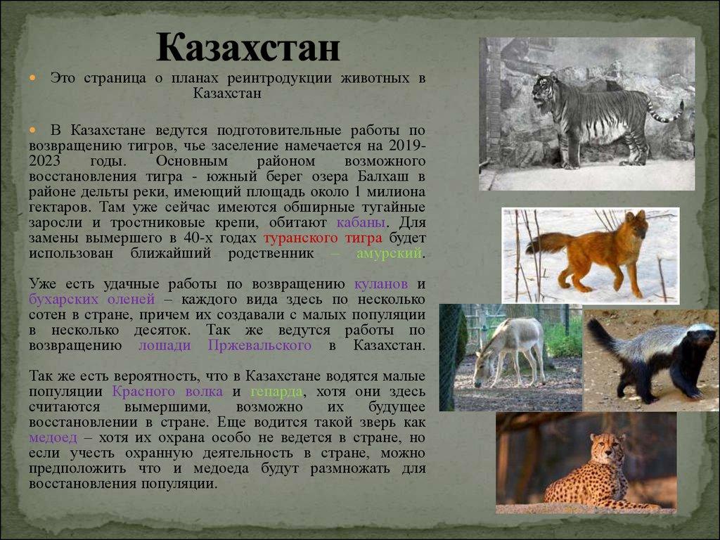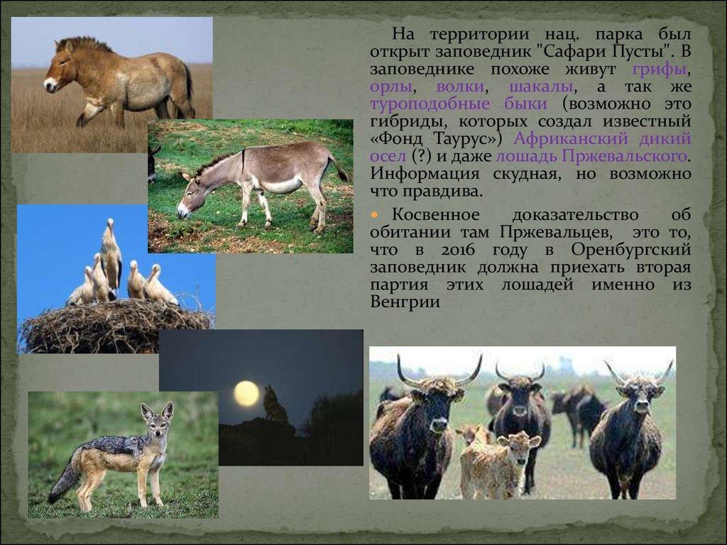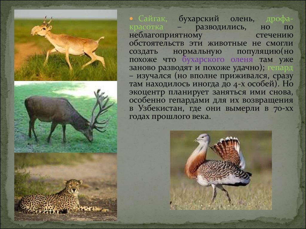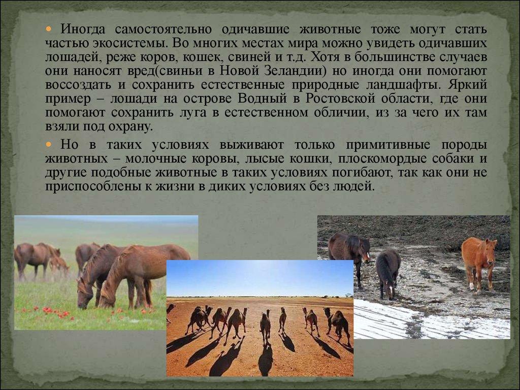 животные сохранились только в домашнем или вторично одичавших формах (коровыпотомки туров, одногорбый верблюд и другие) да и диких животных для таких проектов