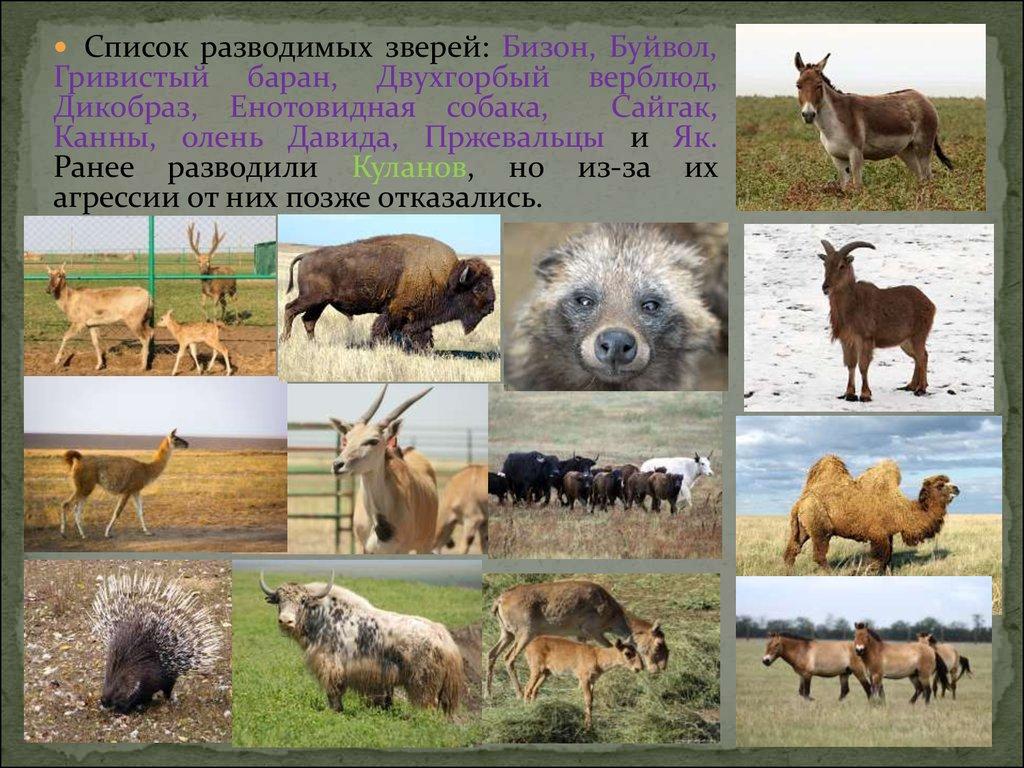 (гибрид собаки и волка). Была попытка разведения пятнистых оленей, но это дело