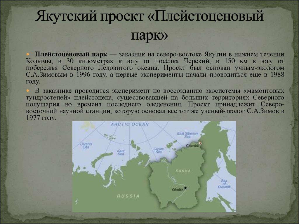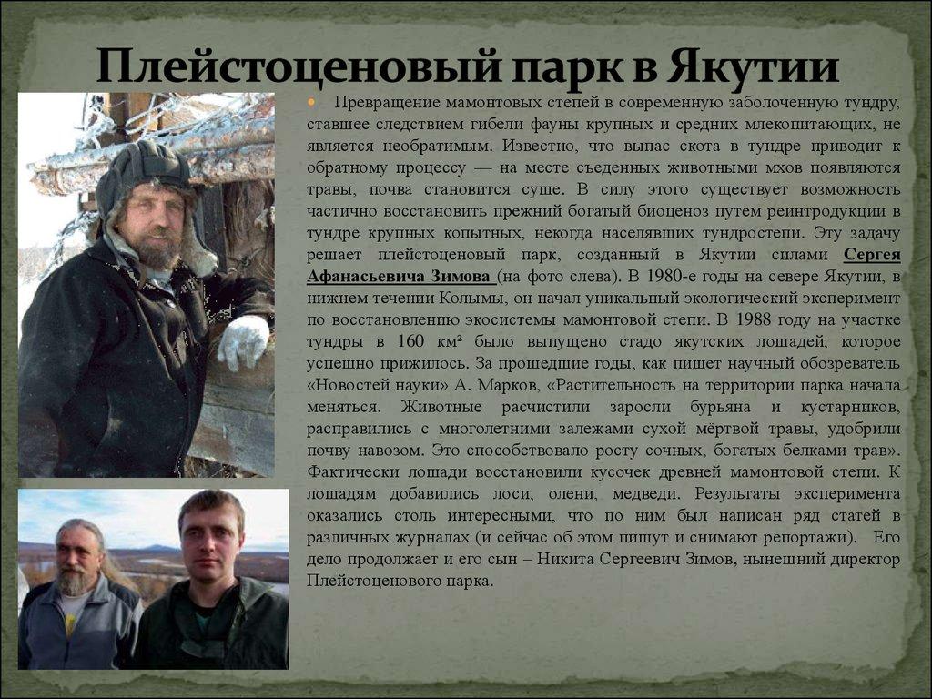 полушария во времена последнего оледенения. Проект принадлежит Северовосточной научной станции, которую основал все тот же ученый-эколог С.А.Зимов в