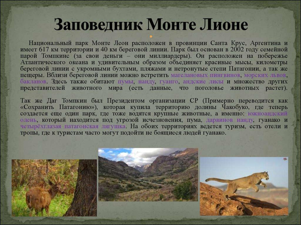 четырёхглазая патагонская лягушка. На обоих территориях ведется туризм, есть отели и