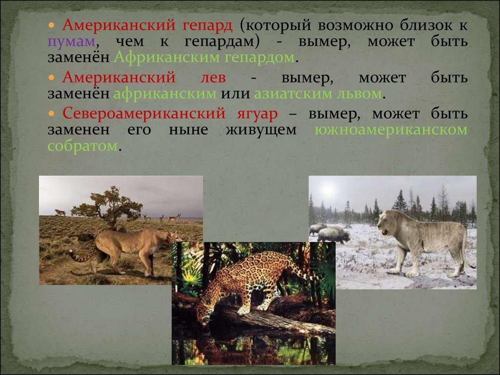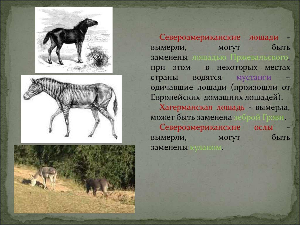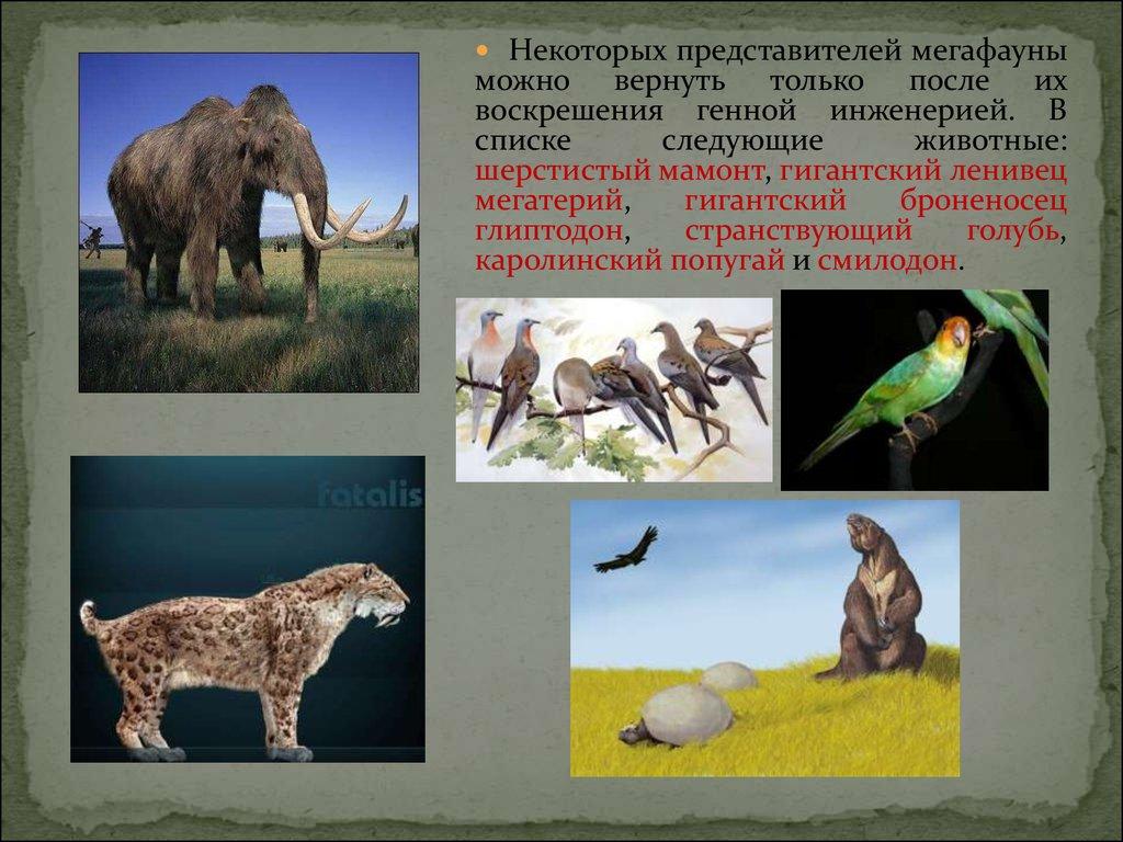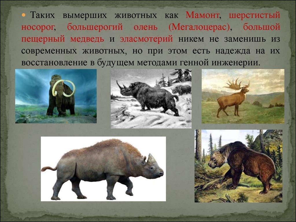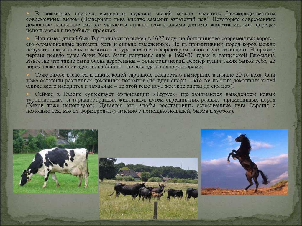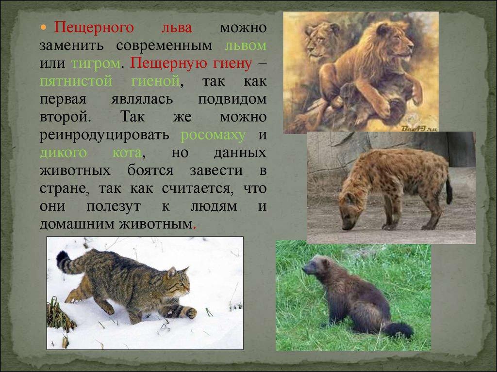 В некоторых случаях вымерших недавно зверей можно заменить близкородственнымсовременным видом (Пещерного льва вполне заменит азиатский лев). Некоторые современные