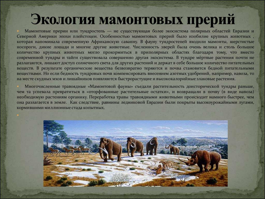 Мамонтовые прерии или тундростепь — не существующая более экосистема полярных областей Евразии иСеверной Америки эпохи плейстоцен. Особенностью мамонтовых прерий было изобилие крупных животных ,