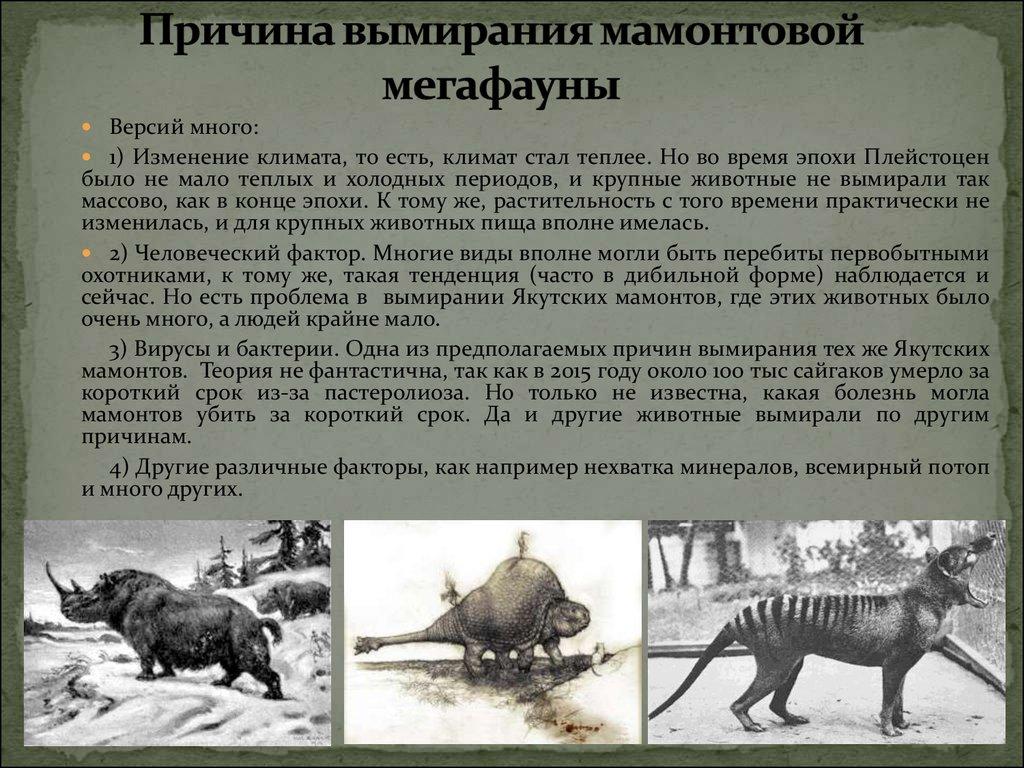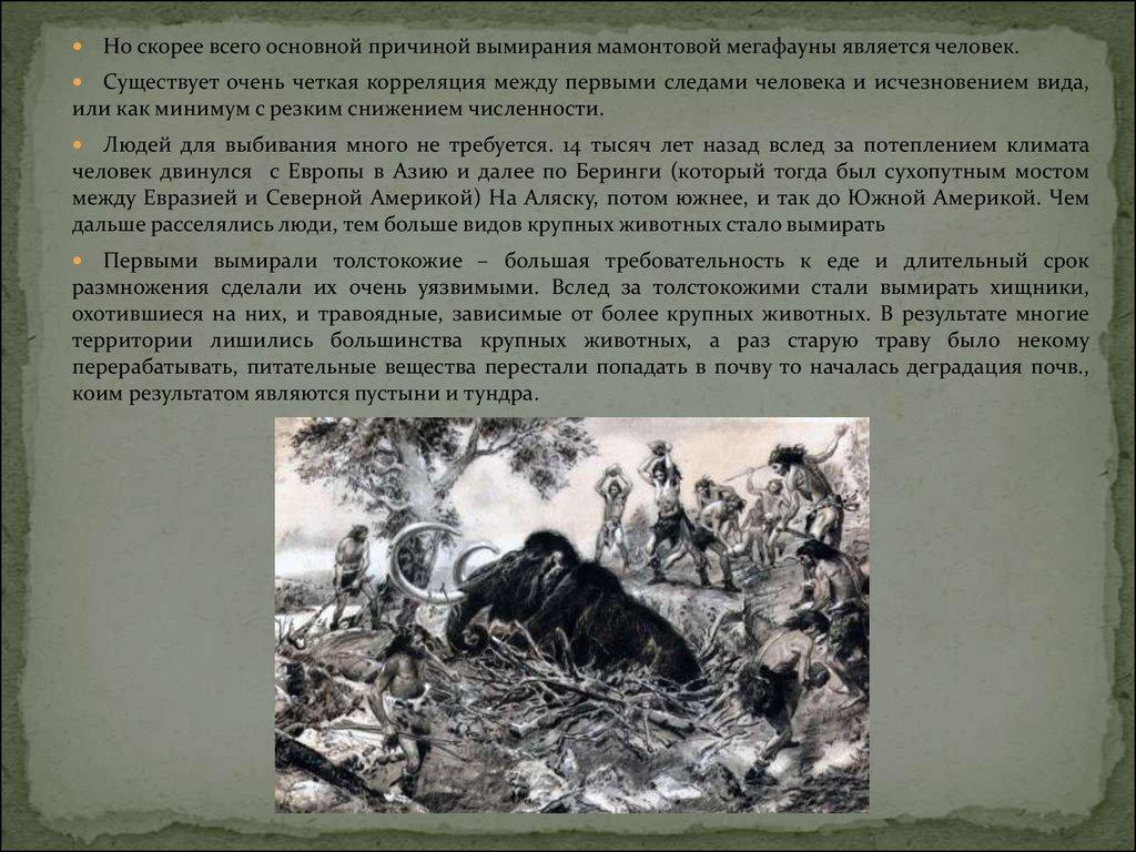 Но скорее всего основной причиной вымирания мамонтовой мегафауны является человек.Существует очень четкая корреляция между первыми следами человека и исчезновением вида,
