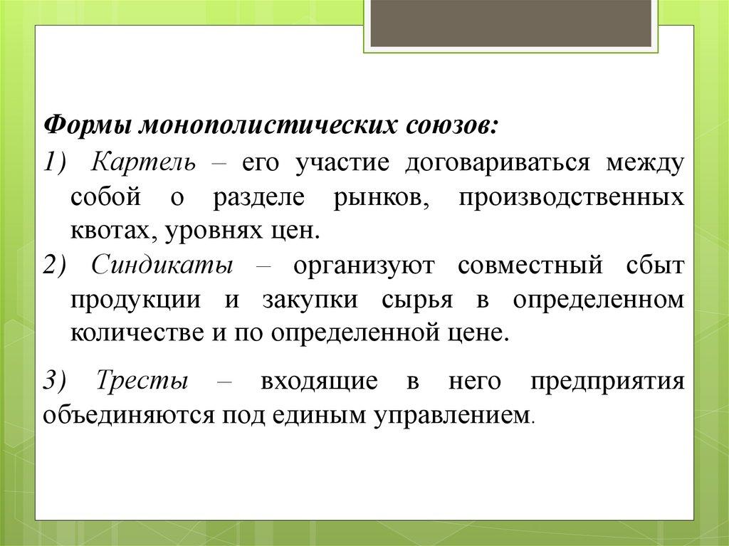 Формы монополистических союзов:1) Картель – его участие договариваться между