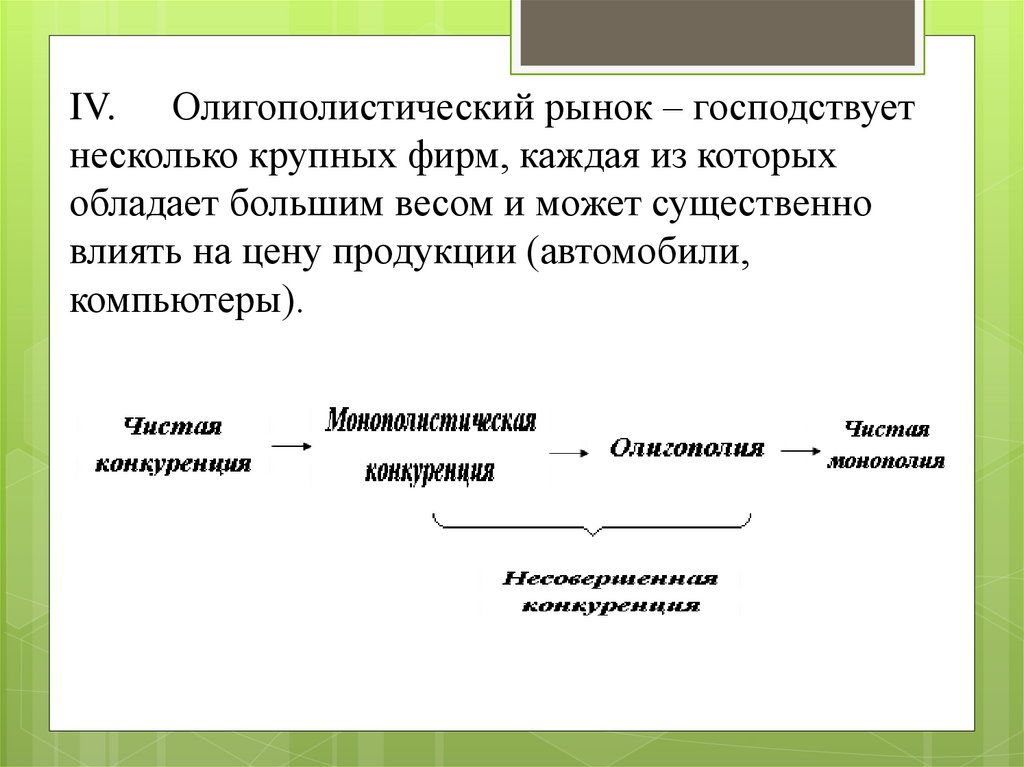 IV. Олигополистический рынок – господствуетнесколько крупных фирм, каждая из которых