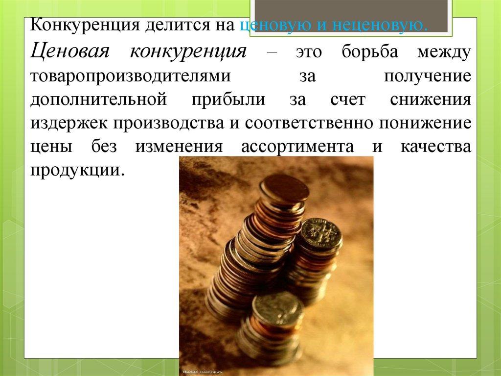 Конкуренция делится на ценовую и неценовую.Ценовая конкуренция – это борьба между