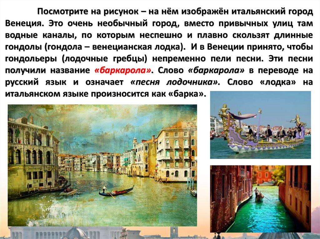 Посмотрите на рисунок – на нём изображён итальянский городВенеция. Это очень необычный город, вместо привычных улиц там