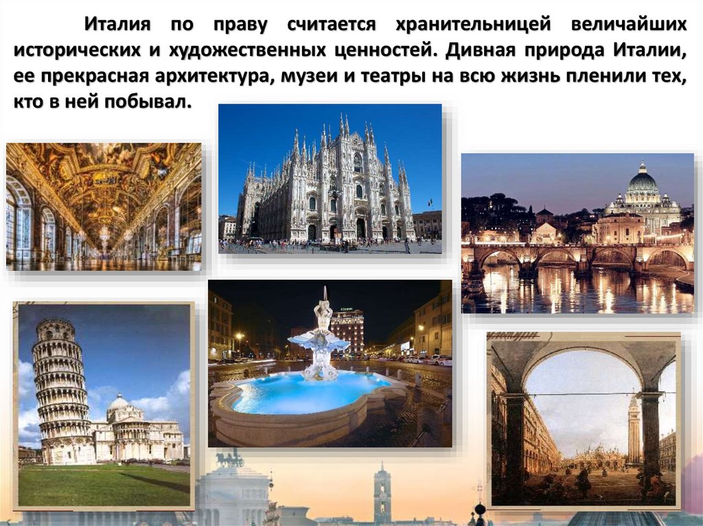 Италия по праву считается хранительницей величайшихисторических и художественных ценностей. Дивная природа Италии,