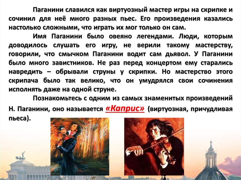 Паганини славился как виртуозный мастер игры на скрипке исочинил для неё много разных пьес. Его произведения казались