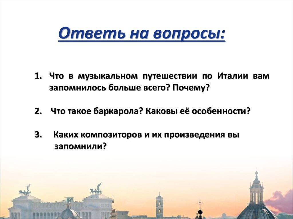 Ответь на вопросы:1. Что в музыкальном путешествии по Италии вам