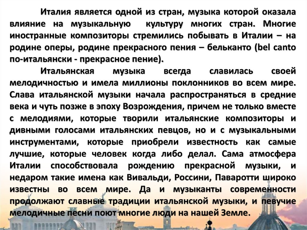 Италии способствовала рождению прекрасной музыки, и