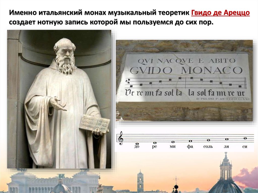 Именно итальянский монах музыкальный теоретик Гвидо де Ареццосоздает нотную запись которой мы пользуемся до сих пор.