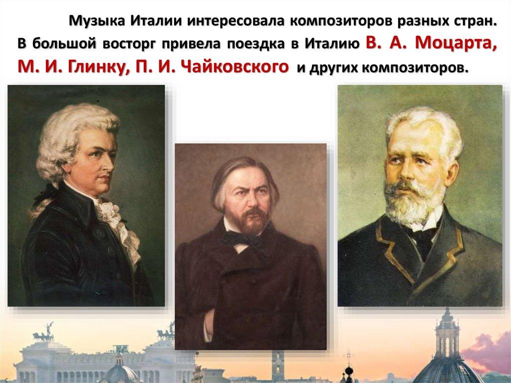 Музыка Италии интересовала композиторов разных стран.В большой восторг привела поездка в Италию В. А. Моцарта,