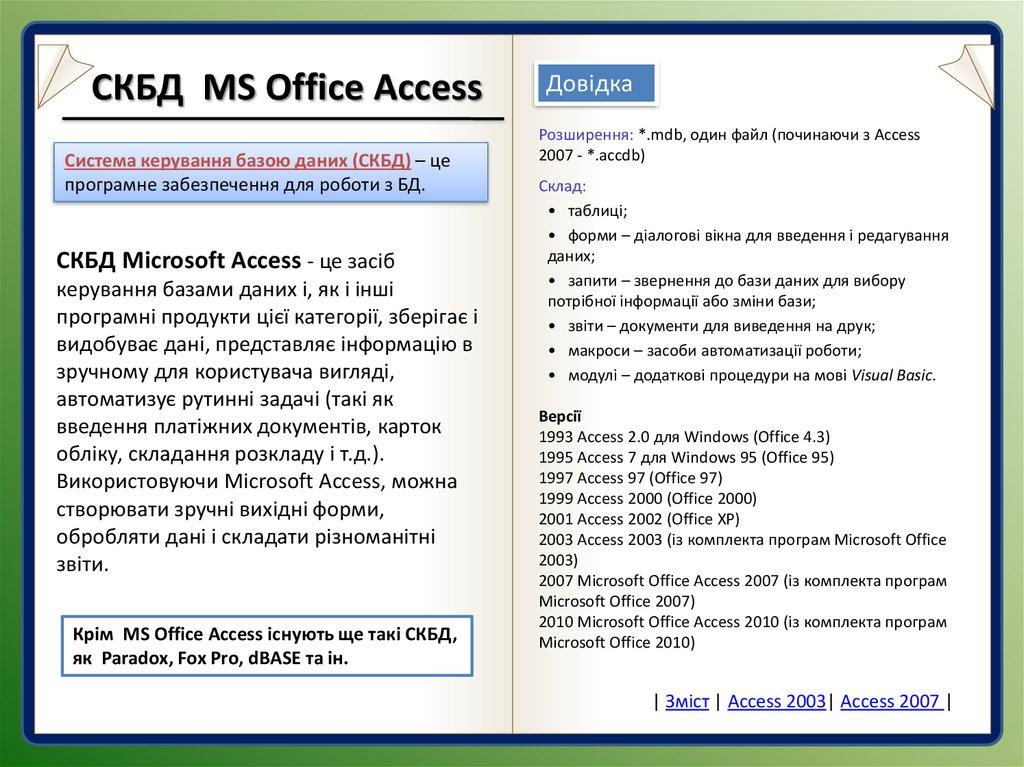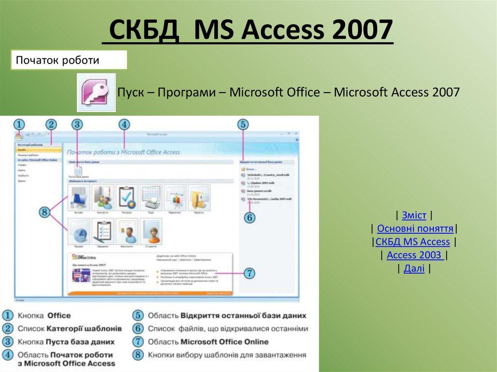| Зміст | Основні поняття | СКБД MS Access | Access 2007 | Далі