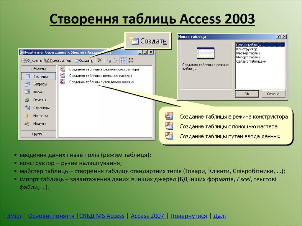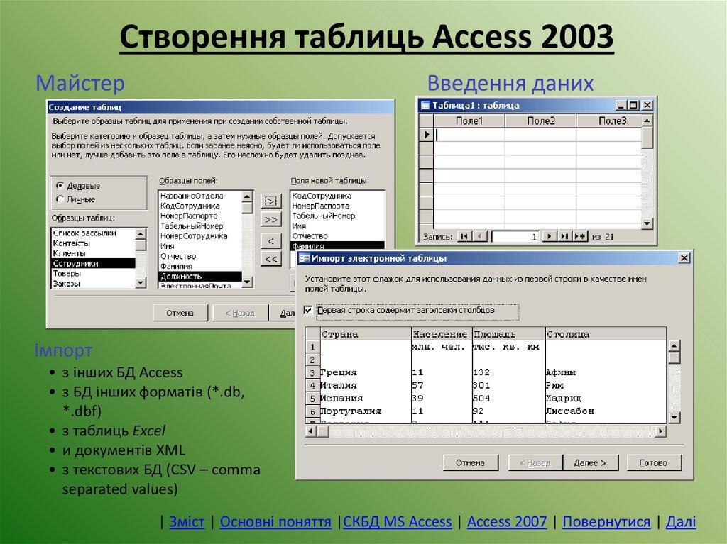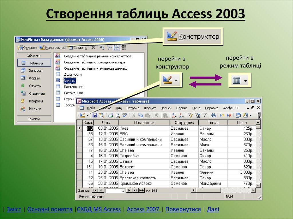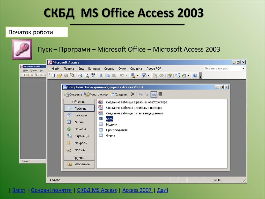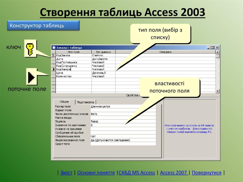 | Зміст | Основні поняття |СКБД MS Access | Access 2003 | Повернутися | Далі