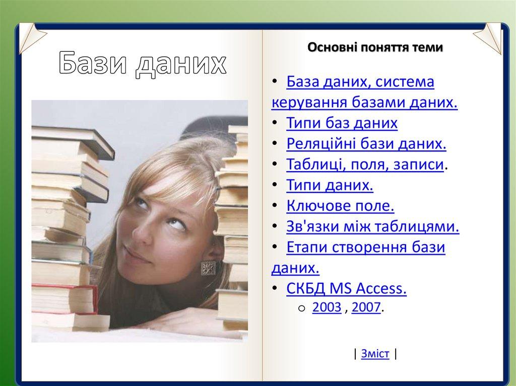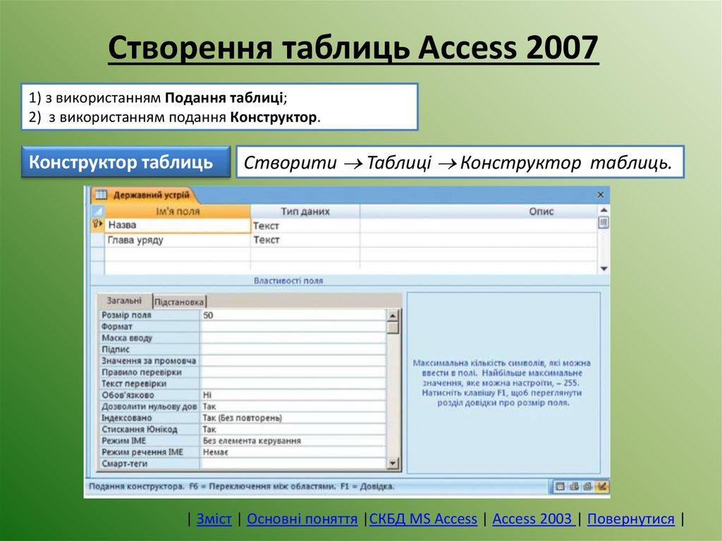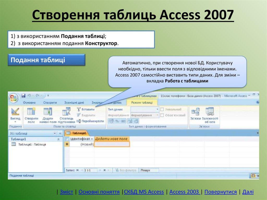 | Зміст | Основні поняття |СКБД MS Access | Access 2007 | Повернутися |