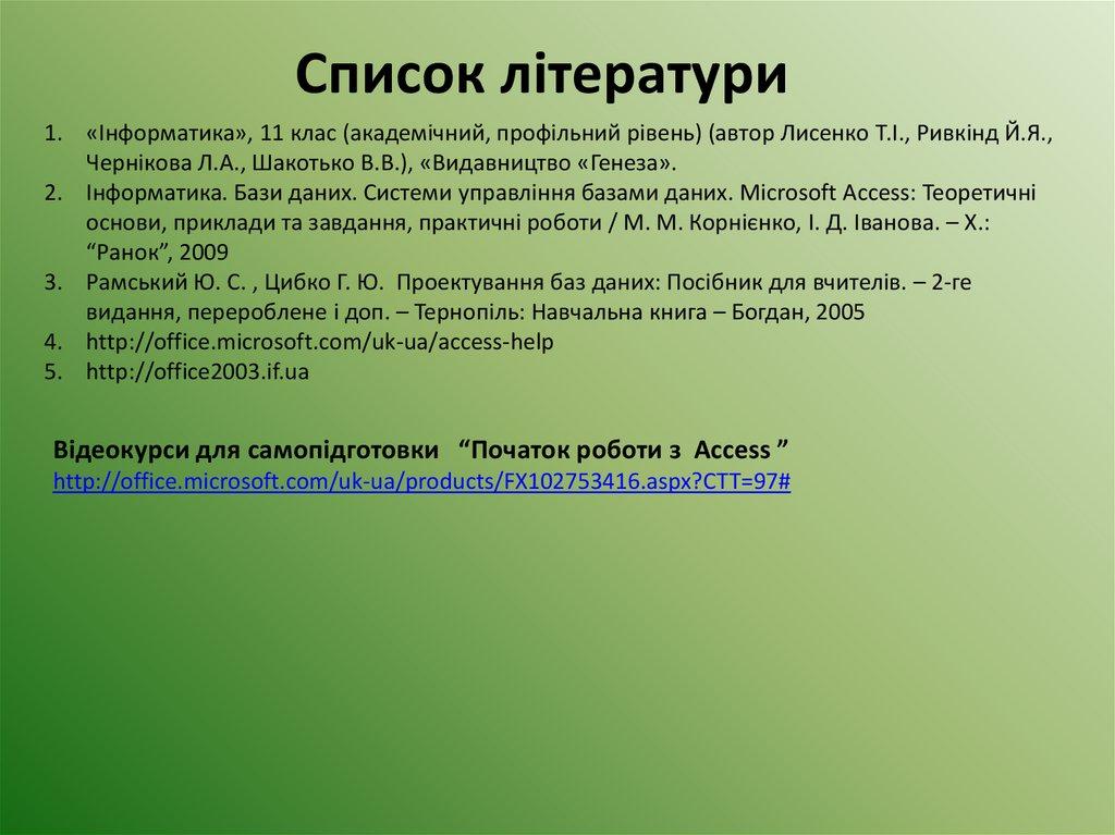 Список літератури1. «Інформатика», 11 клас (академічний, профільний рівень) (автор Лисенко Т.І., Ривкінд Й.Я.,