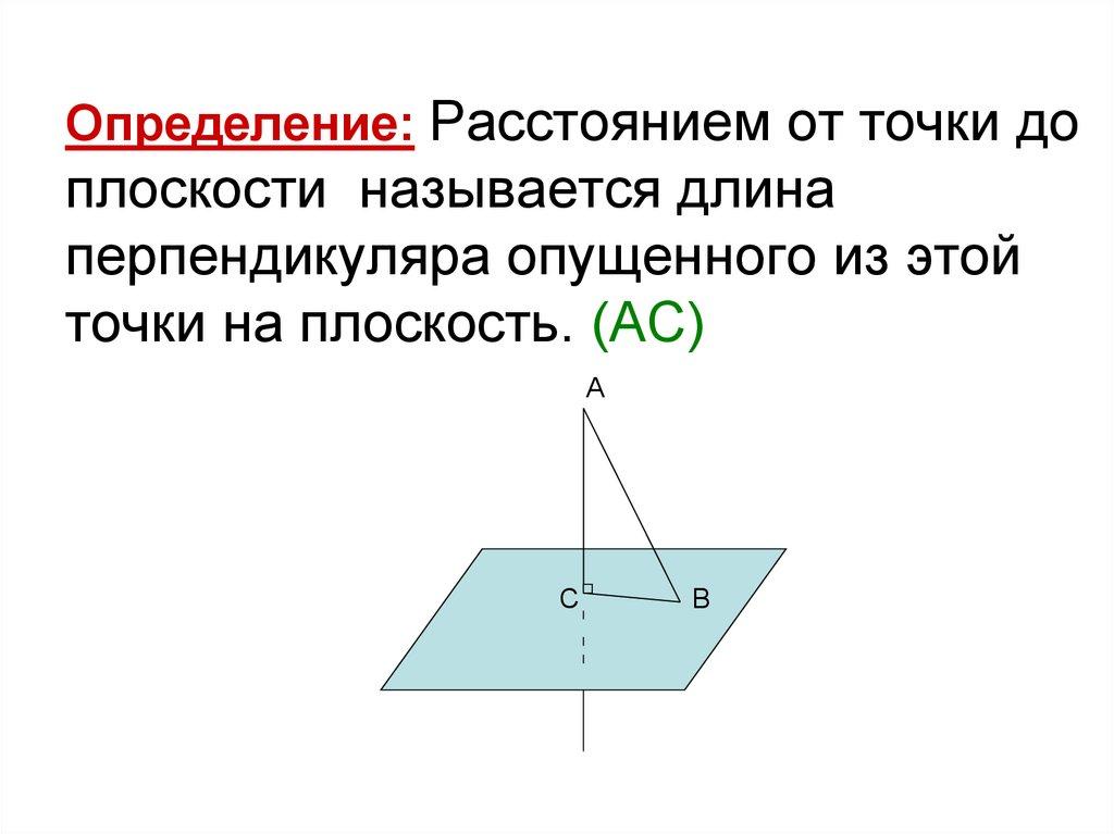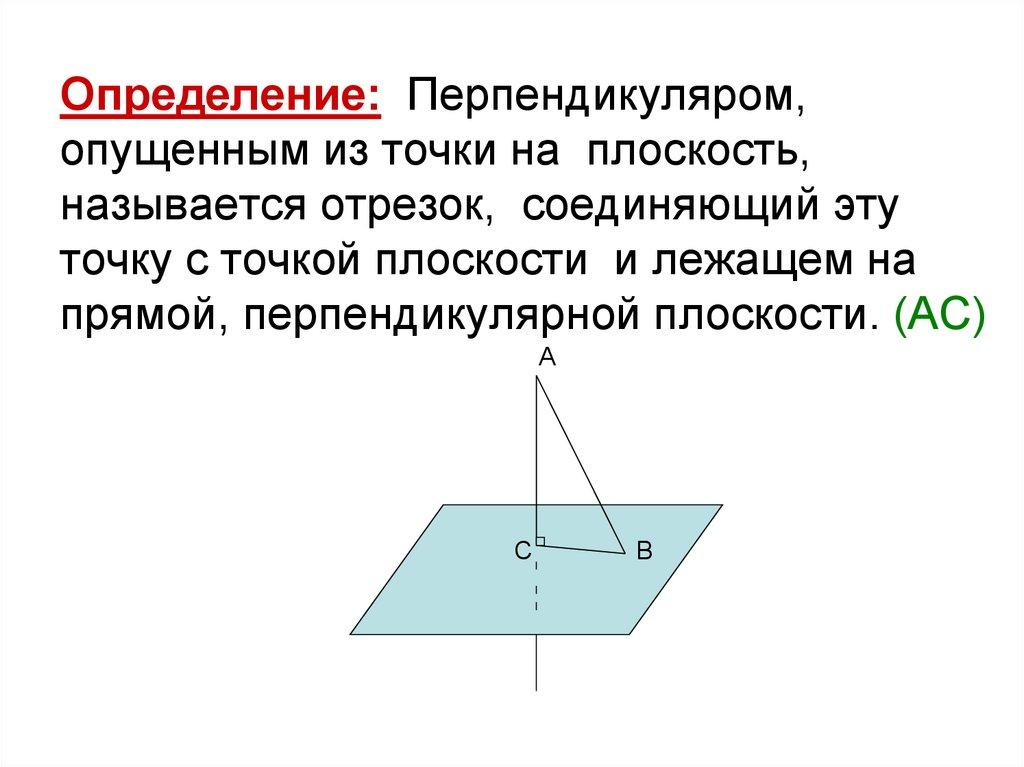 Определение: Перпендикуляром,опущенным из точки на плоскость,