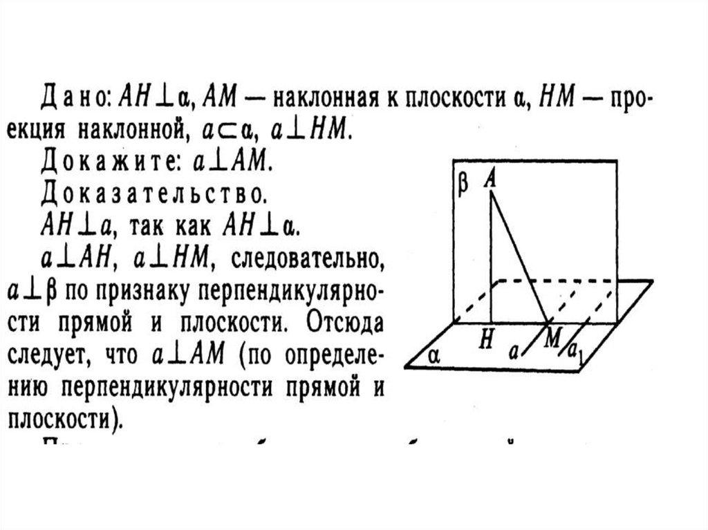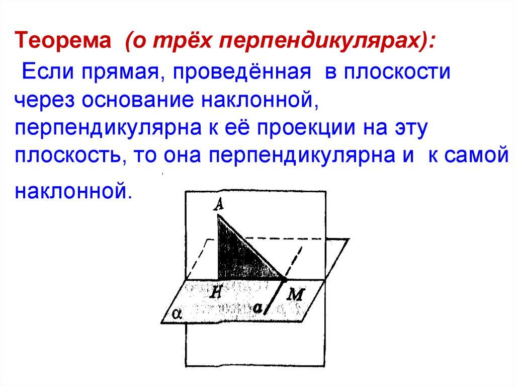 Теорема (о трёх перпендикулярах):Если прямая, проведённая в плоскости