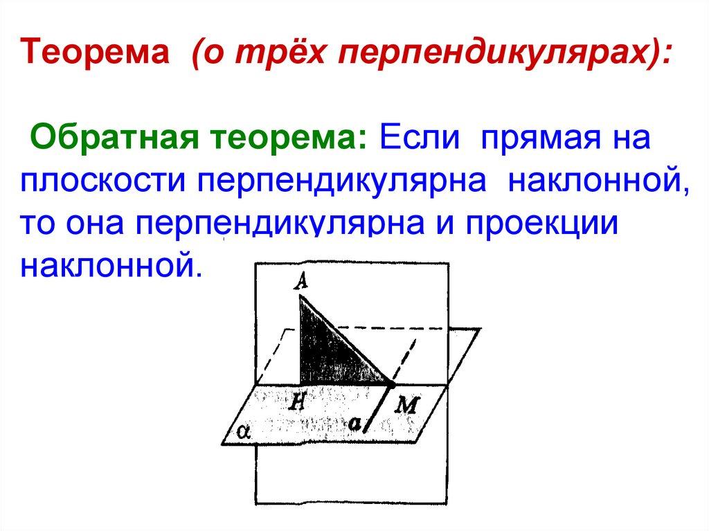Теорема (о трёх перпендикулярах):Обратная теорема: Если прямая на