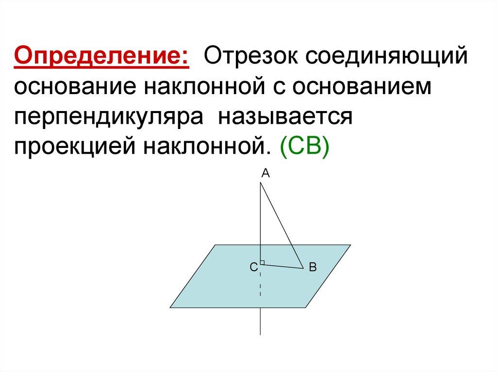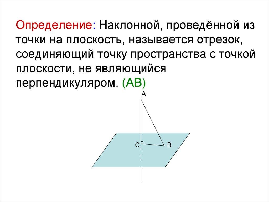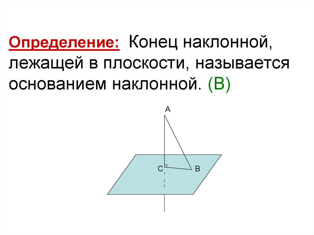 Определение: Наклонной, проведённой източки на плоскость, называется отрезок,